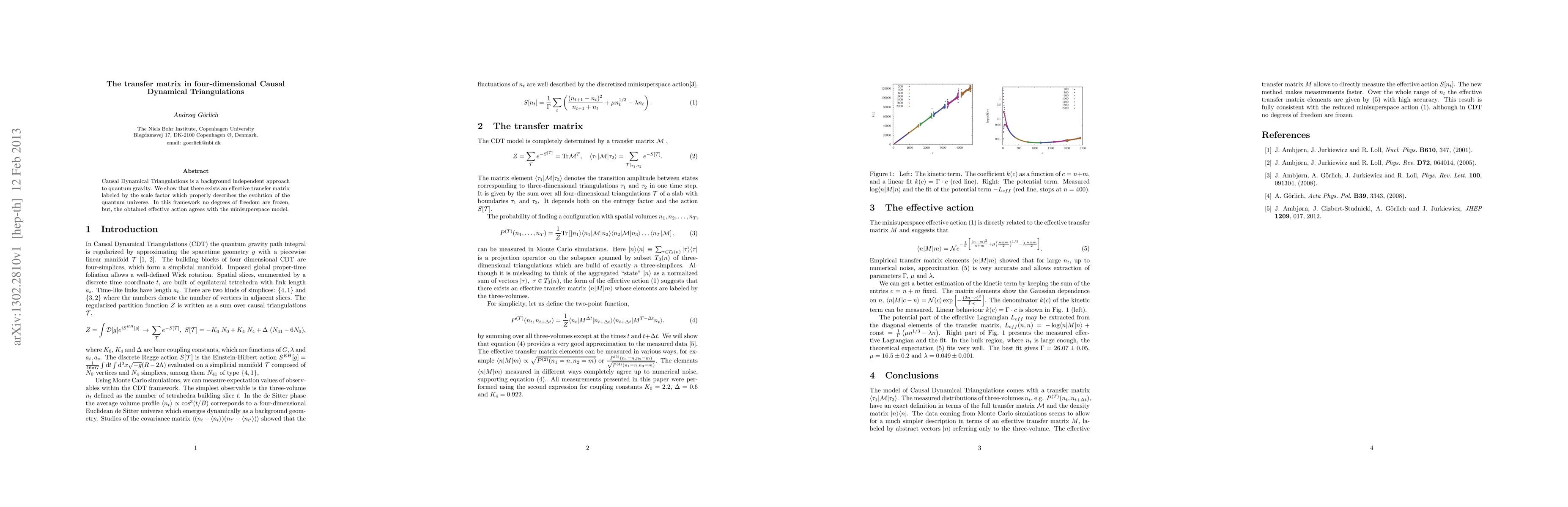 Summary: This paper introduces an effective transfer matrix for four-dimensional causal dynamical triangulations, demonstrating its ability to describe the evolution of the quantum universe without freezing degrees of freedom, while aligning with the minisuperspace model.
