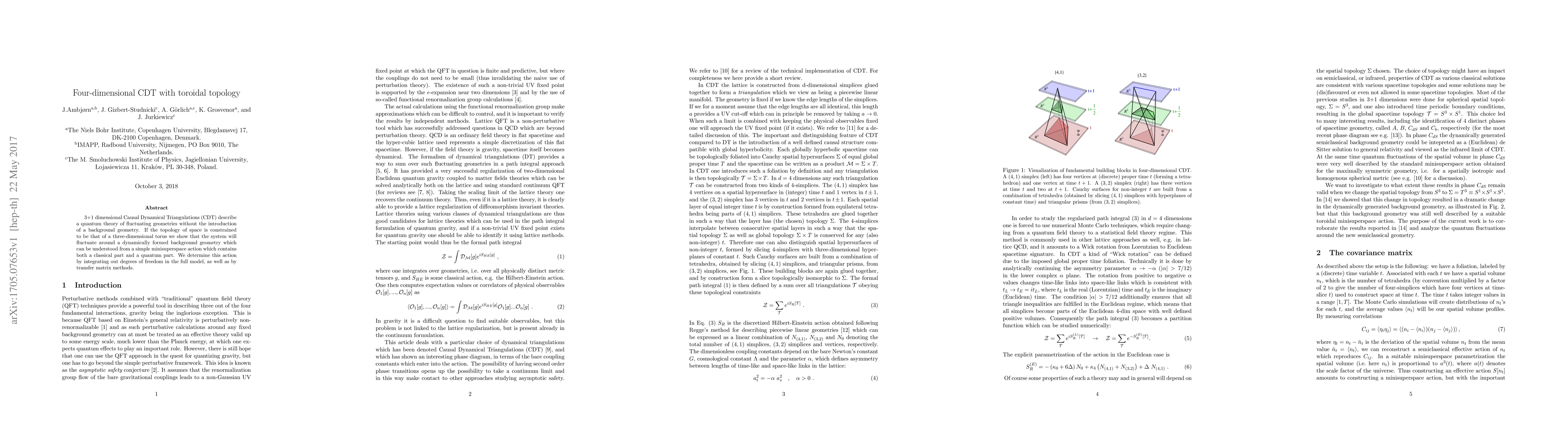 This paper explores 4-dimensional Causal Dynamical Triangulations (CDT) with a toroidal topology, demonstrating that the system fluctuates around a dynamically formed background geometry described by a minisuperspace action incorporating both classical and quantum components. The action is derived through integration and transfer matrix methods.