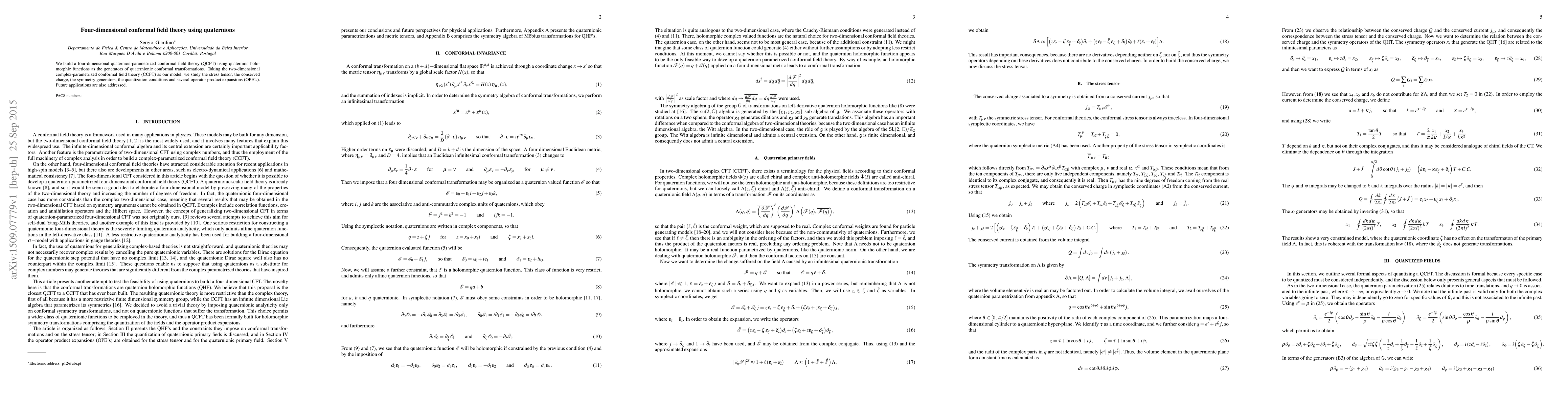 The paper introduces a quaternion-parametrized conformal field theory (QCFT) using quaternion holomorphic functions for quaternionic conformal transformations, extending the concept of conformal field theory to four dimensions.