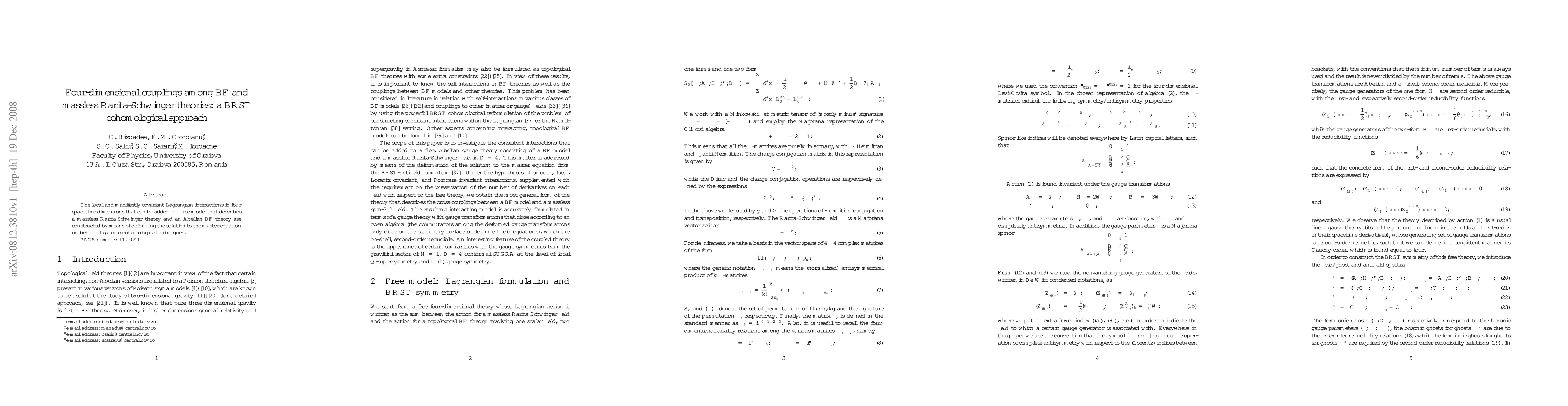 The local and manifestly covariant Lagrangian interactions in four spacetime dimensions that can be added to a free model that describes a massless Rarita-Schwinger theory and an Abelian BF theory are constructed by means of deforming the solution to the master equation on behalf of specific cohomological techniques.