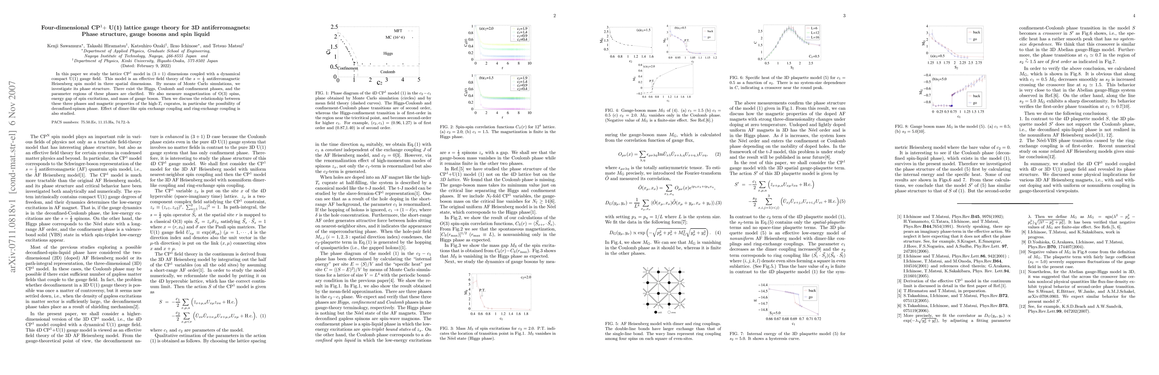 In this paper we study the lattice CP$^1$ model in (3+1) dimensions coupled with a dynamical compact U(1) gauge field. This model is an effective field theory of the $s={1 \over 2}$ antiferromagnetic Heisenberg spin model in three spatial dimensions. By means of Monte Carlo simulations, we investigate its phase structure. There exist the Higgs, Coulomb and confinement phases, and the parameter regions of these phases are clarified. We also measure magnetization of O(3) spins, energy gap of spin excitations, and mass of gauge boson. Then we discuss the relationship between these three phases and magnetic properties of the high-$T_{\rm c}$ cuprates, in particular the possibility of deconfined-spinon phase. Effect of dimer-like spin exchange coupling and ring-exchange coupling is also studied.