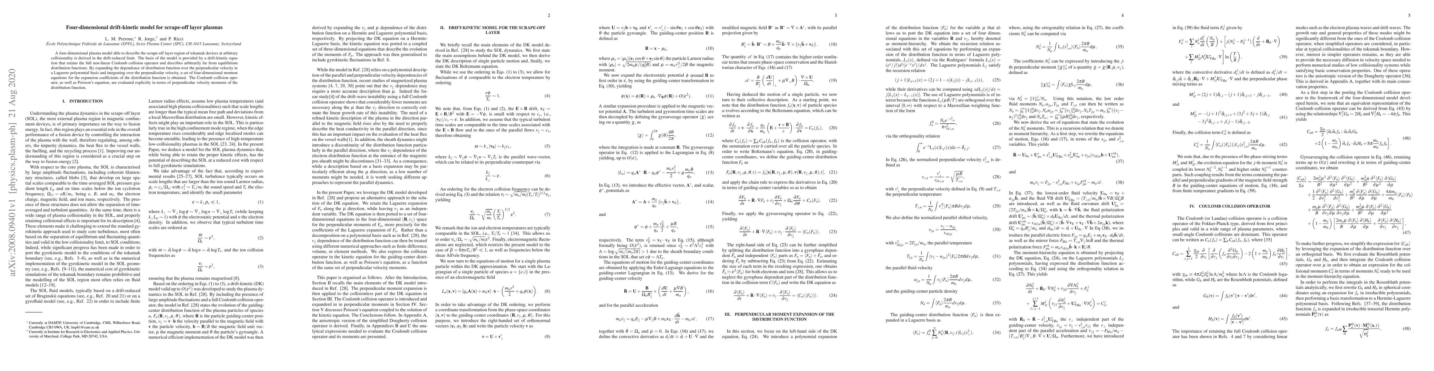 This paper develops a four-dimensional drift-kinetic model for tokamak plasmas' scrape-off layer, retaining full non-linear Coulomb collisions and describing far-from-equilibrium distribution functions. It uses a drift-kinetic equation and Laguerre polynomial basis to derive moment equations for plasma dynamics.