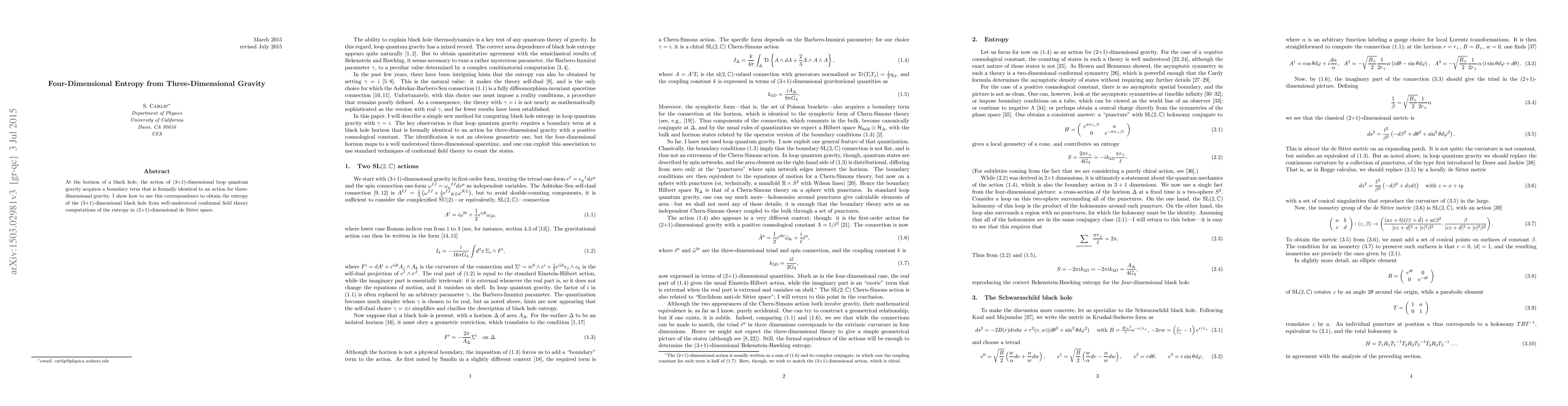At the horizon of a black hole, the action of (3+1)-dimensional loop quantum gravity acquires a boundary term that is formally identical to an action for three-dimensional gravity. I show how to use this correspondence to obtain the entropy of the (3+1)-dimensional black hole from well-understood conformal field theory computations of the entropy in (2+1)-dimensional de Sitter space.