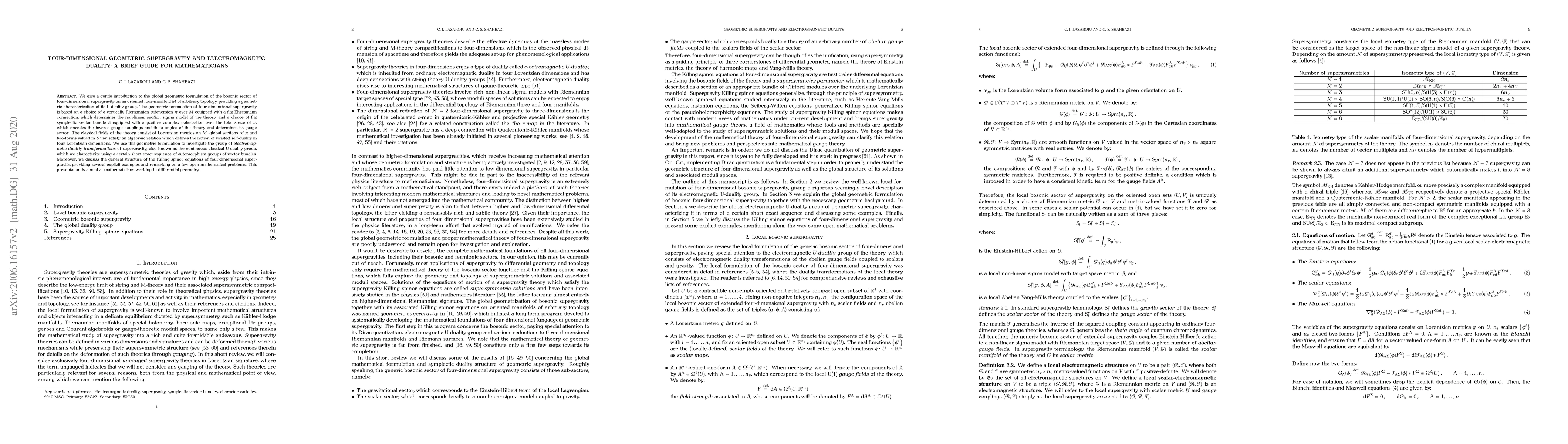 We give a gentle introduction to the global geometric formulation of the bosonic sector of four-dimensional supergravity on an oriented four-manifold $M$ of arbitrary topology, providing a geometric characterization of its U-duality group. The geometric formulation of four-dimensional supergravity is based on a choice of a vertically Riemannian submersion $\pi$ over $M$ equipped with a flat Ehresmann connection, which determines the non-linear section sigma model of the theory, and a choice of flat symplectic vector bundle $\mathcal{S}$ equipped with a positive complex polarization over the total space of $\pi$, which encodes the inverse gauge couplings and theta angles of the theory and determines its gauge sector. The classical fields of the theory consist of Lorentzian metrics on $M$, global sections of $\pi$ and two-forms valued in $\mathcal{S}$ that satisfy an algebraic relation which defines the notion of \emph{twisted} self-duality in four Lorentzian dimensions. We use this geometric formulation to investigate the group of electromagnetic duality transformations of supergravity, also known as the continuous classical U-duality group, which we characterize using a certain short exact sequence of automorphism groups of vector bundles. Moreover, we discuss the general structure of the Killing spinor equations of four-dimensional supergravity, providing several explicit examples and remarking on a few open mathematical problems. This presentation is aimed at mathematicians working in differential geometry.