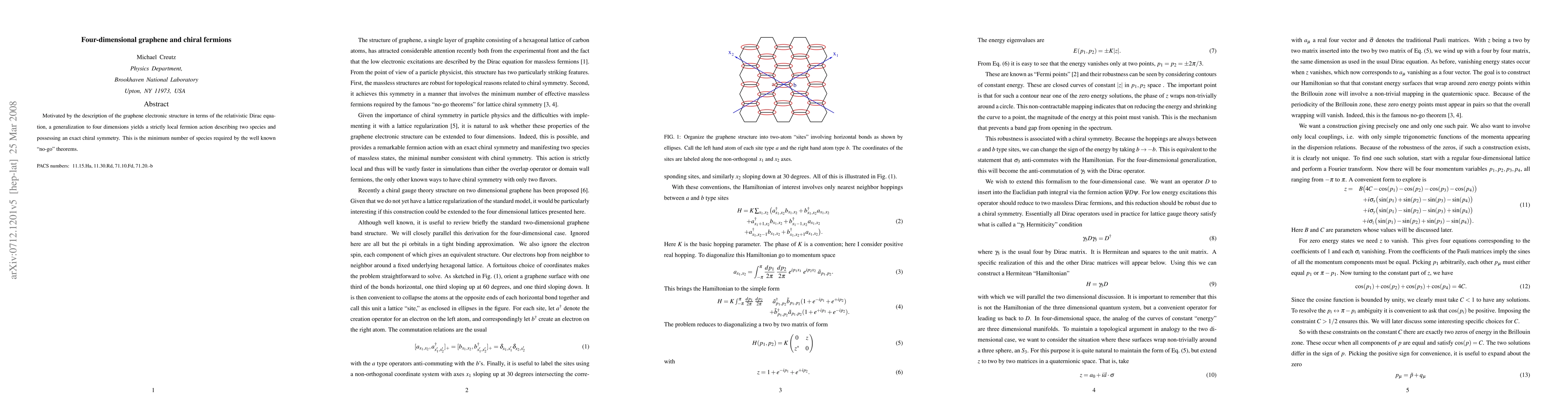 Motivated by the description of the graphene electronic structure in terms of the relativistic Dirac equation, a generalization to four dimensions yields a strictly local fermion action describing two species and possessing an exact chiral symmetry. This is the minimum number of species required by the well known ``no-go'' theorems.