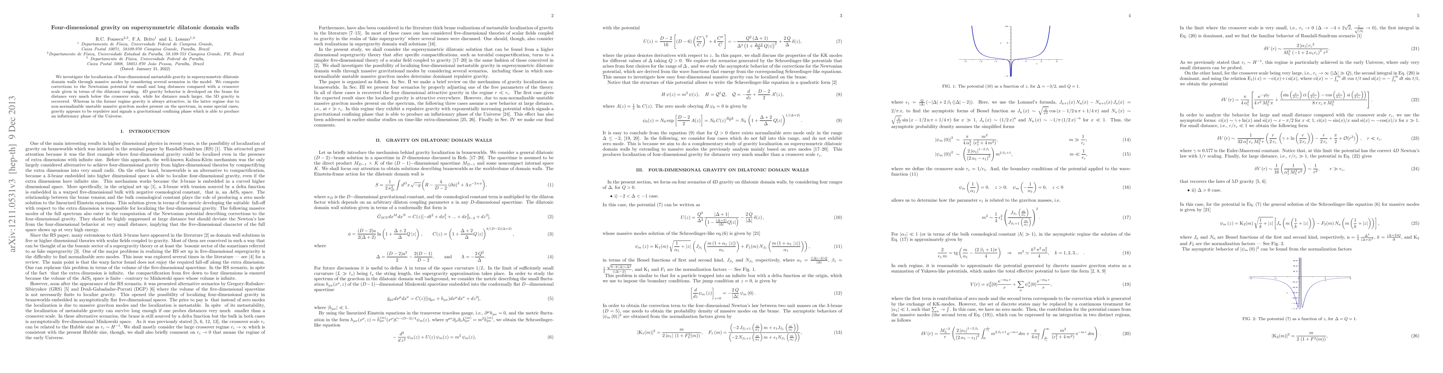We investigate the localization of four-dimensional metastable gravity in supersymmetric dilatonic domain walls through massive modes by considering several scenarios in the model. We compute corrections to the Newtonian potential for small and long distances compared with a crossover scale given in terms of the dilatonic coupling. 4D gravity behavior is developed on the brane for distance very much below the crossover scale, while for distance much larger, the 5D gravity is recovered. Whereas in the former regime gravity is always attractive, in the latter regime due to non-normalizable unstable massive graviton modes present on the spectrum, in some special cases, gravity appears to be repulsive and signalizes a gravitational confining phase which is able to produce an inflationary phase of the Universe.