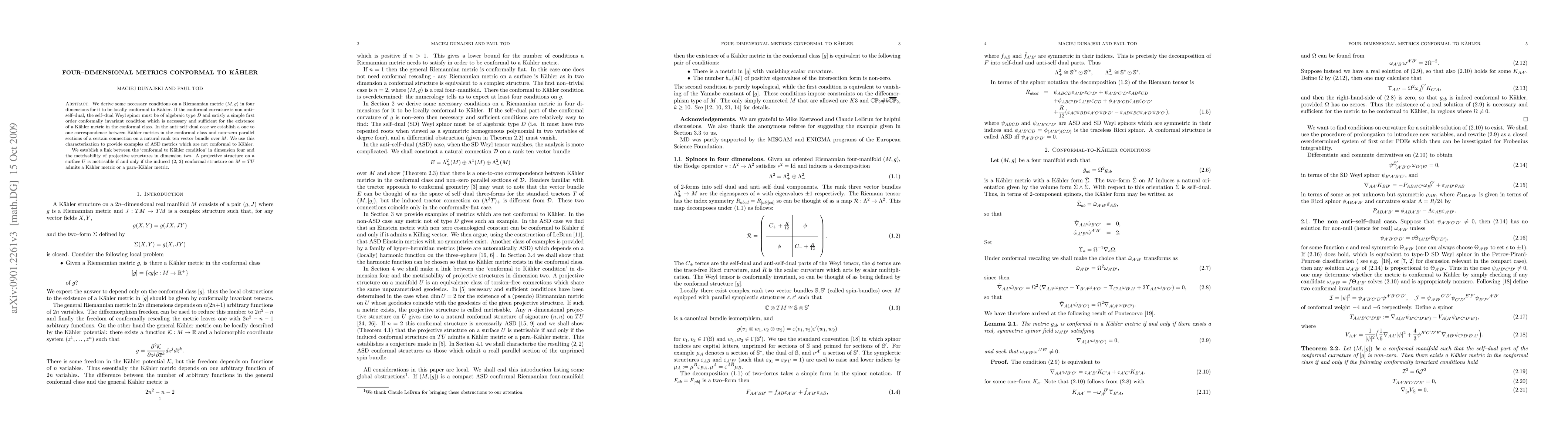 We derive some necessary conditions on a Riemannian metric $(M, g)$ in four dimensions for it to be locally conformal to K\"ahler. If the conformal curvature is non anti--self--dual, the self--dual Weyl spinor must be of algebraic type $D$ and satisfy a simple first order conformally invariant condition which is necessary and sufficient for the existence of a K\"ahler metric in the conformal class. In the anti--self--dual case we establish a one to one correspondence between K\"ahler metrics in the conformal class and non--zero parallel sections of a certain connection on a natural rank ten vector bundle over $M$. We use this characterisation to provide examples of ASD metrics which are not conformal to K\"ahler. We establish a link between the `conformal to K\"ahler condition' in dimension four and the metrisability of projective structures in dimension two. A projective structure on a surface $U$ is metrisable if and only if the induced (2, 2) conformal structure on $M=TU$ admits a K\"ahler metric or a para-K\"ahler metric.