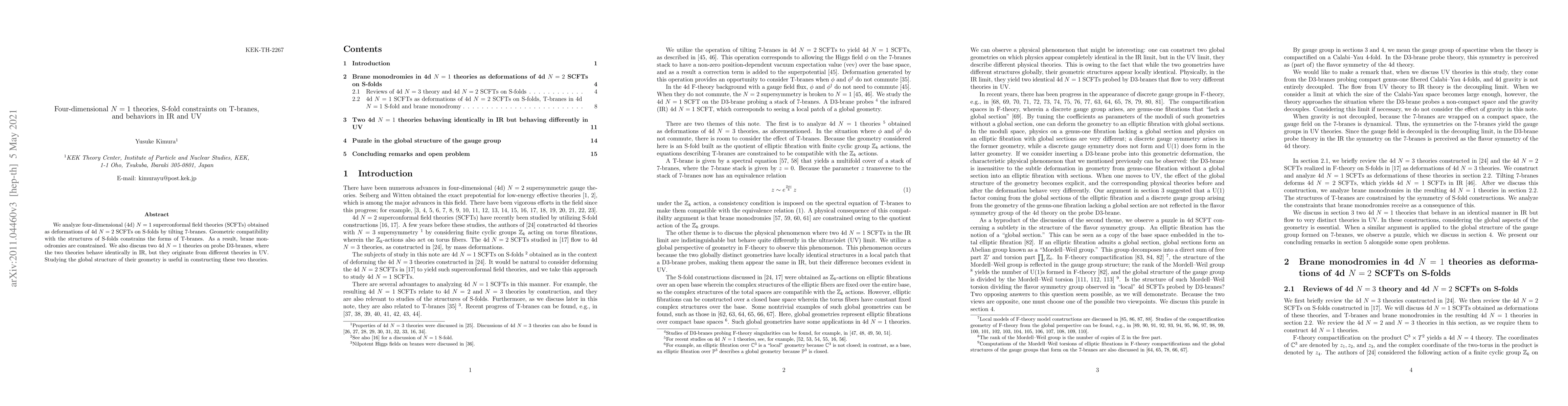 This paper explores 4d $N=1$ superconformal field theories derived from 4d $N=2$ SCFTs on S-folds via 7-brane tilting, highlighting constraints on T-brane forms due to geometric compatibility with S-folds. It also investigates two distinct 4d $N=1$ theories on probe D3-branes that behave identically in the infrared but differ in their ultraviolet origins, emphasizing the importance of geometry in their global structure.
