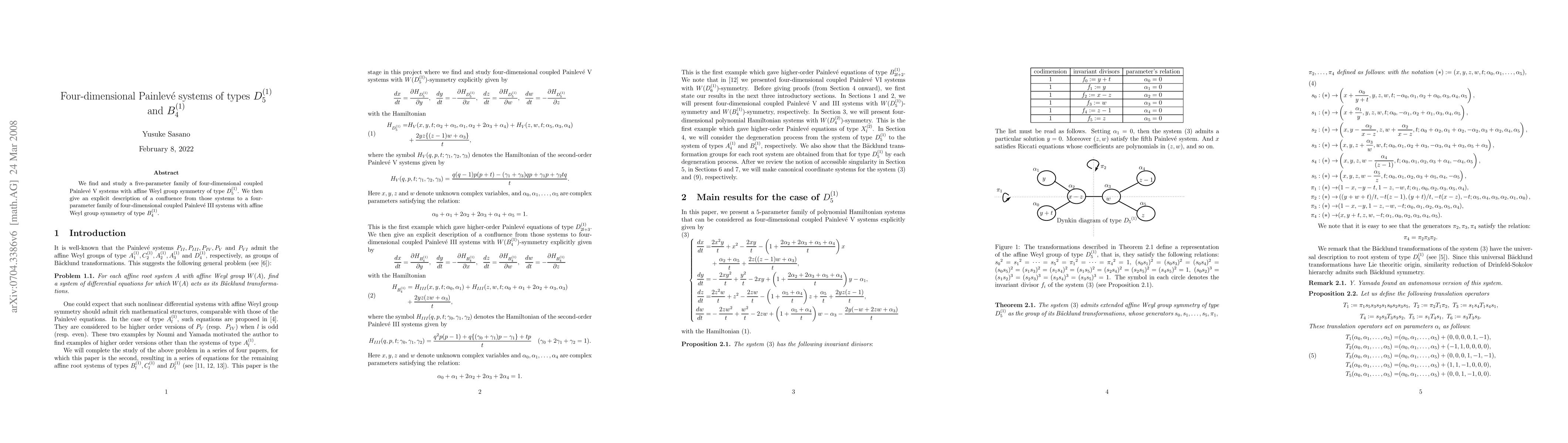 This paper identifies a five-parameter family of four-dimensional coupled Painlevé V systems with $D_5^{(1)}$ symmetry and describes a confluence process leading to a four-parameter family of four-dimensional coupled Painlevé III systems with $B_4^{(1)}$ symmetry.