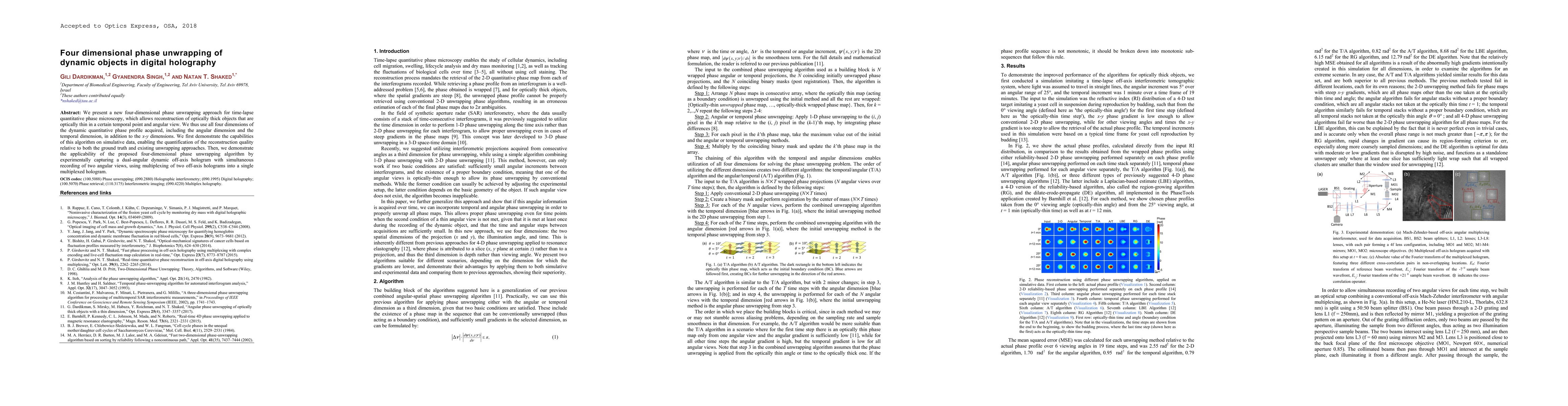 We present a new four-dimensional phase unwrapping approach for time-lapse quantitative phase microscopy, which allows reconstruction of optically thick objects that are optically thin in a certain temporal point and angular view. We thus use all four dimensions of the dynamic quantitative phase profile acquired, including the angular dimension and the temporal dimension, in addition to the x-y dimensions. We first demonstrate the capabilities of this algorithm on simulative data, enabling the quantification of the reconstruction quality relative to both the ground truth and existing unwrapping approaches. Then, we demonstrate the applicability of the proposed four-dimensional phase unwrapping algorithm by experimentally capturing a dual-angular dynamic off-axis hologram with simultaneous recording of two angular views, using multiplexing of two off-axis holograms into a single multiplexed hologram.