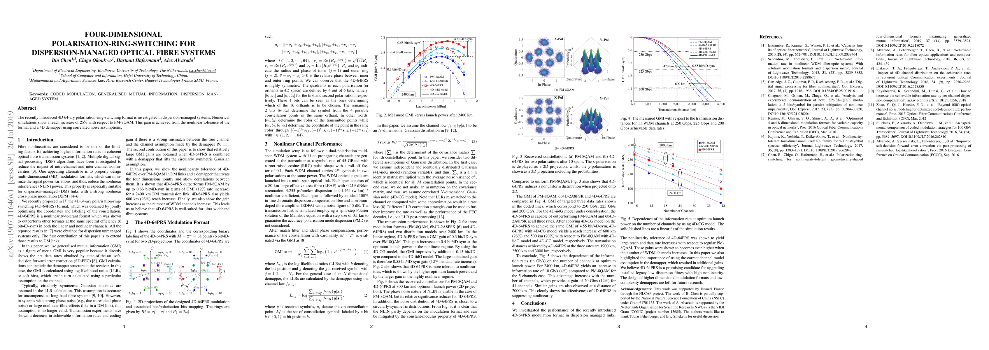 Summary: This research investigates the 4D 64-ary polarization-ring-switching format in dispersion-managed optical fibre systems, demonstrating a 25% increase in reach compared to PM-8QAM, attributed to its nonlinear tolerance and a 4D demapper based on correlated noise assumptions.