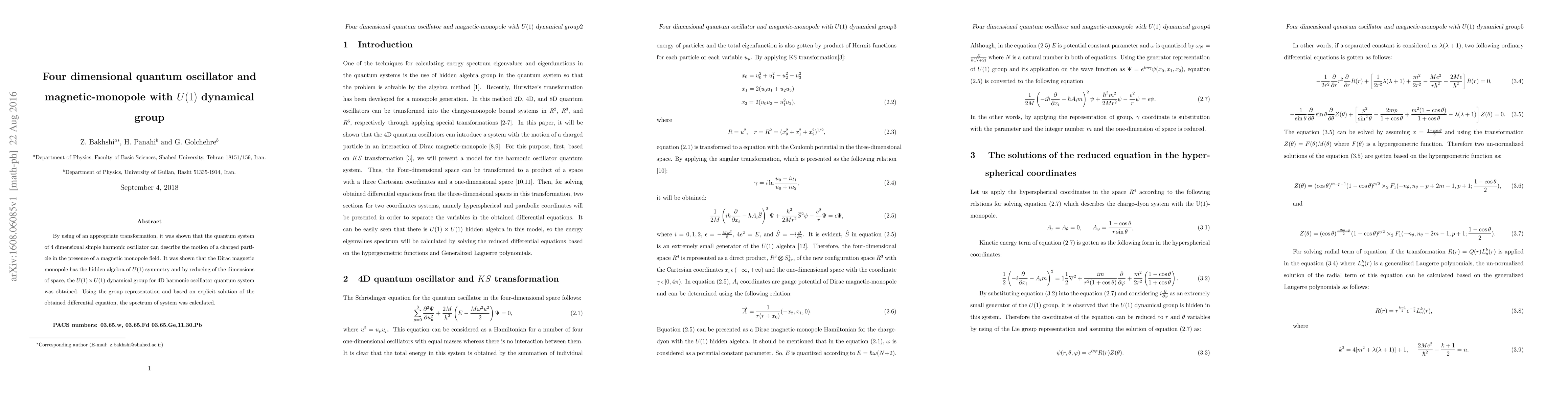 Researchers show that a 4D quantum oscillator can describe a charged particle's motion near a magnetic monopole, using the U(1) dynamical group.
