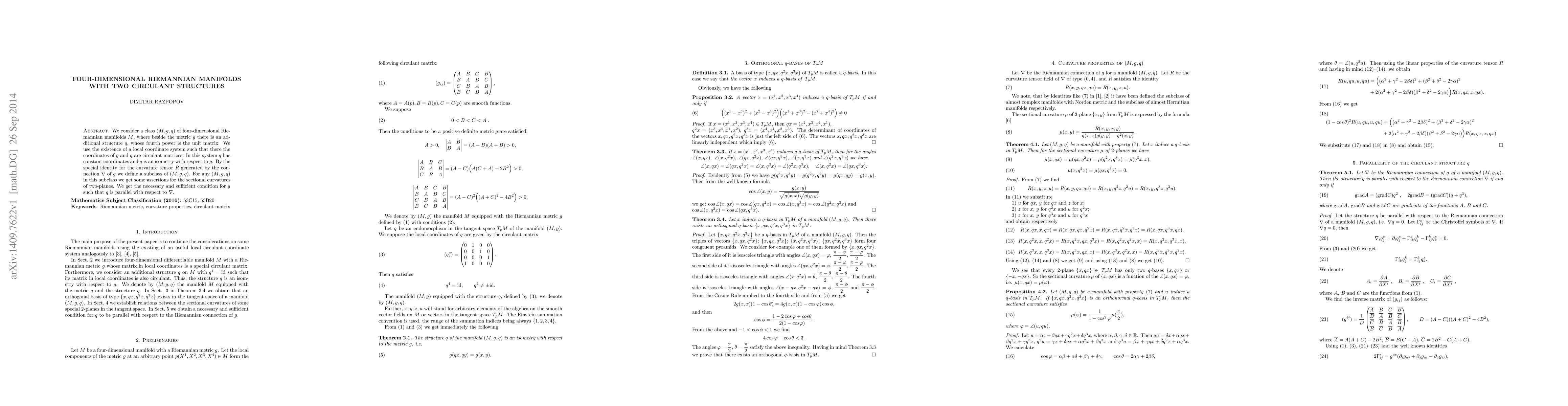 We consider a class (M, g, q) of four-dimensional Riemannian manifolds M, where besides the metric g there is an additional structure q, whose fourth power is the unit matrix. We use the existence of a local coordinate system such that there the coordinates of g and q are circulant matrices. In this system q has constant coordinates and q is an isometry with respect to g. By the special identity for the curvature tensor R generated by the Riemannian connection of g we define a subclass of (M, g, q). For any (M, g, q) in this subclass we get some assertions for the sectional curvatures of two-planes. We get the necessary and sufficient condition for g such that q is parallel with respect to the Riemannian connection of g.