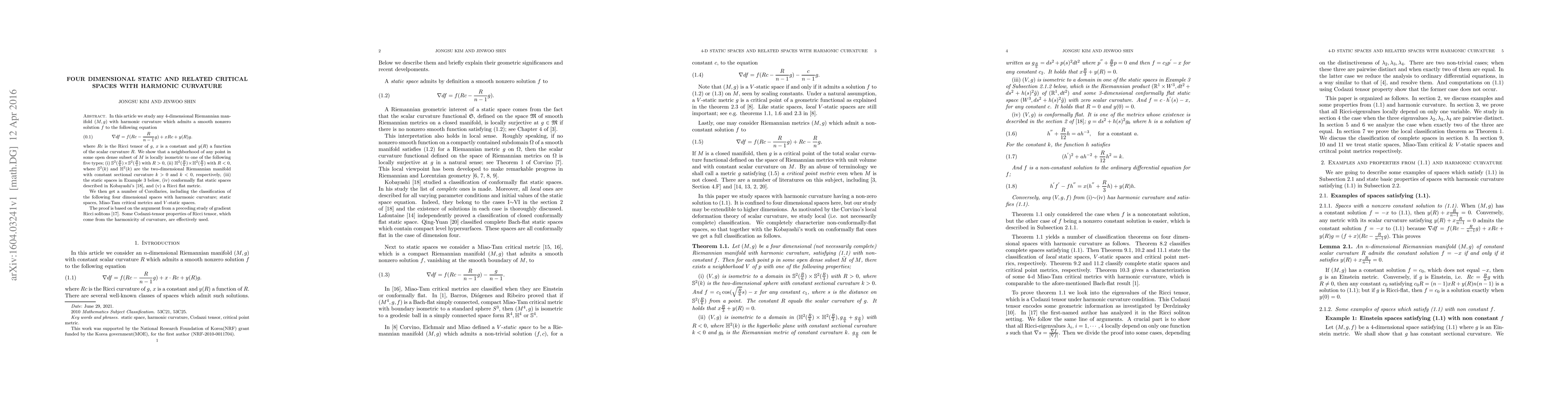In this article we study any 4-dimensional Riemannian manifold $(M,g)$ with harmonic curvature which admits a smooth nonzero solution $f$ to the following equation \begin{eqnarray} \label{0002bx} \nabla df = f(Rc -\frac{R}{n-1} g) + x Rc+ y(R) g. \end{eqnarray} where $Rc$ is the Ricci tensor of $g$, $x$ is a constant and $y(R)$ a function of the scalar curvature $R$. We show that a neighborhood of any point in some open dense subset of $M$ is locally isometric to one of the following five types; {\rm (i)} $ \mathbb{S}^2(\frac{R}{6}) \times \mathbb{S}^2(\frac{R}{3})$ with $R>0$, {\rm (ii)} $ \mathbb{H}^2(\frac{R}{6}) \times \mathbb{H}^2(\frac{R}{3}) $ with $R<0$, where $\mathbb{S}^2(k) $ and $\mathbb{H}^2(k) $ are the two-dimensional Riemannian manifold with constant sectional curvature $k>0$ and $k<0$, respectively, {\rm (iii)} the static spaces in Example 3 below, {\rm (iv)} conformally flat static spaces described in Kobayashi's \cite{Ko}, and {\rm (v)} a Ricci flat metric. We then get a number of Corollaries, including the classification of the following four dimensional spaces with harmonic curvature; static spaces, Miao-Tam critical metrics and $V$-static spaces. The proof is based on the argument from a preceding study of gradient Ricci solitons \cite{Ki}. Some Codazzi-tensor properties of Ricci tensor, which come from the harmonicity of curvature, are effectively used.