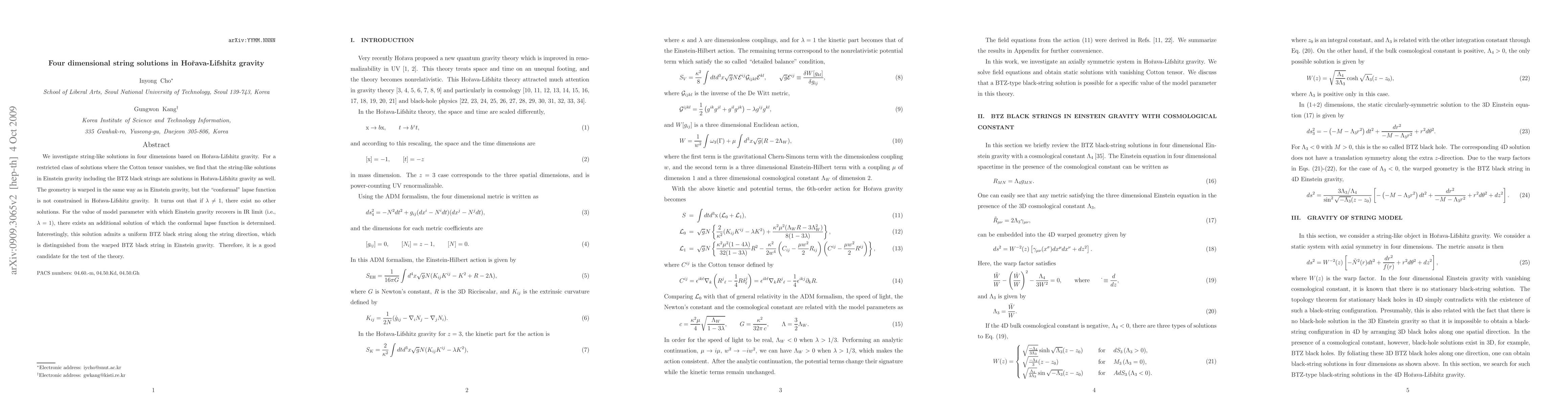 We investigate string-like solutions in four dimensions based on Ho\v{r}ava-Lifshitz gravity. For a restricted class of solutions where the Cotton tensor vanishes, we find that the string-like solutions in Einstein gravity including the BTZ black strings are solutions in Ho\v{r}ava-Lifshitz gravity as well. The geometry is warped in the same way as in Einstein gravity, but the "conformal" lapse function is not constrained in Ho\v{r}ava-Lifshitz gravity. It turns out that if $\lambda \ne 1$, there exist no other solutions. For the value of model parameter with which Einstein gravity recovers in IR limit (i.e., $\lambda=1$), there exists an additional solution of which the conformal lapse function is determined. Interestingly, this solution admits a uniform BTZ black string along the string direction, which is distinguished from the warped BTZ black string in Einstein gravity. Therefore, it is a good candidate for the test of the theory.