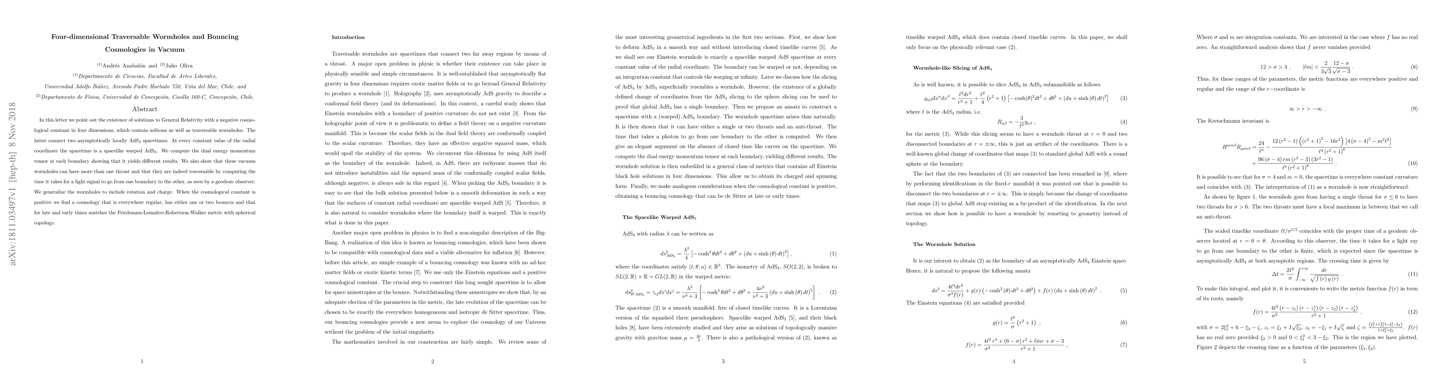 In this letter we point out the existence of solutions to General Relativity with a negative cosmological constant in four dimensions, which contain solitons as well as traversable wormholes. The latter connect two asymptotically locally AdS$_{4}$ spacetimes. At every constant value of the radial coordinate the spacetime is a spacelike warped AdS$_{3}$. We compute the dual energy momentum tensor at each boundary showing that it yields different results. We also show that these vacuum wormholes can have more than one throat and that they are indeed traversable by computing the time it takes for a light signal to go from one boundary to the other, as seen by a geodesic observer. We generalize the wormholes to include rotation and charge. When the cosmological constant is positive we find a cosmology that is everywhere regular, has either one or two bounces and that for late and early times matches the Friedmann-Lema\^{\i}tre-Robertson-Walker metric with spherical topology.