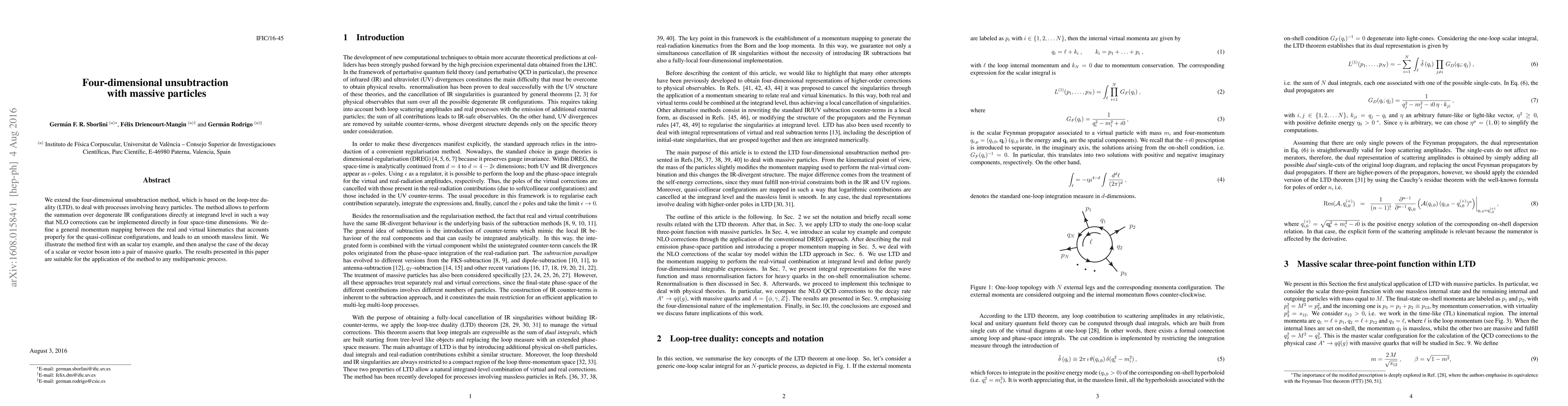 We extend the four-dimensional unsubtraction method, which is based on the loop-tree duality (LTD), to deal with processes involving heavy particles. The method allows to perform the summation over degenerate IR configurations directly at integrand level in such a way that NLO corrections can be implemented directly in four space-time dimensions. We define a general momentum mapping between the real and virtual kinematics that accounts properly for the quasi-collinear configurations, and leads to an smooth massless limit. We illustrate the method first with an scalar toy example, and then analyse the case of the decay of a scalar or vector boson into a pair of massive quarks. The results presented in this paper are suitable for the application of the method to any multipartonic process.