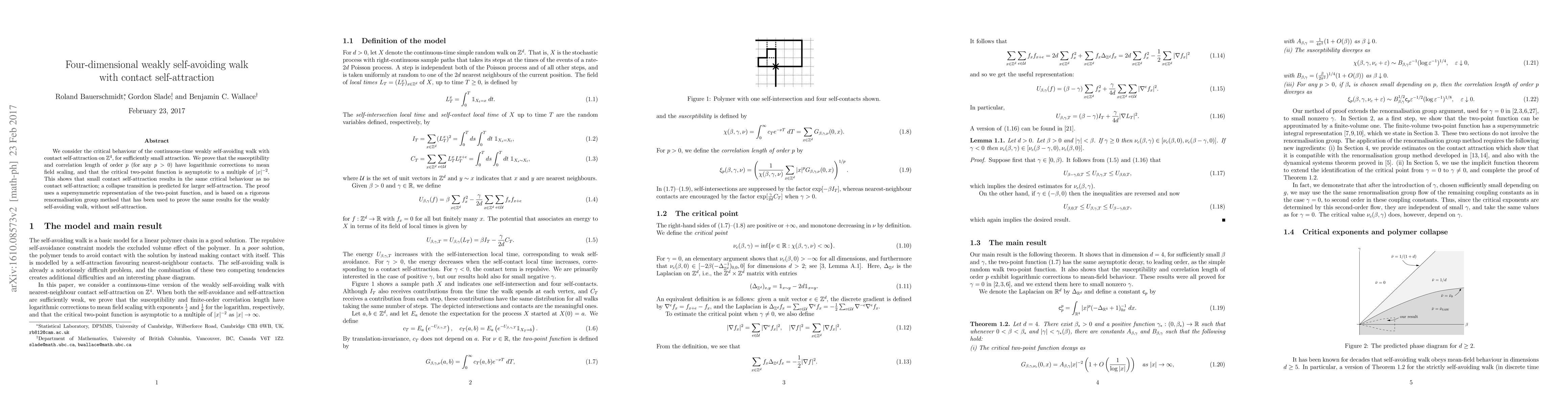 This paper investigates the critical behavior of a weakly self-avoiding walk with contact self-attraction in four dimensions, showing that small attraction leads to logarithmic corrections to mean field scaling. The study predicts a collapse transition for larger self-attraction, using a supersymmetric representation and rigorous renormalisation group methods.