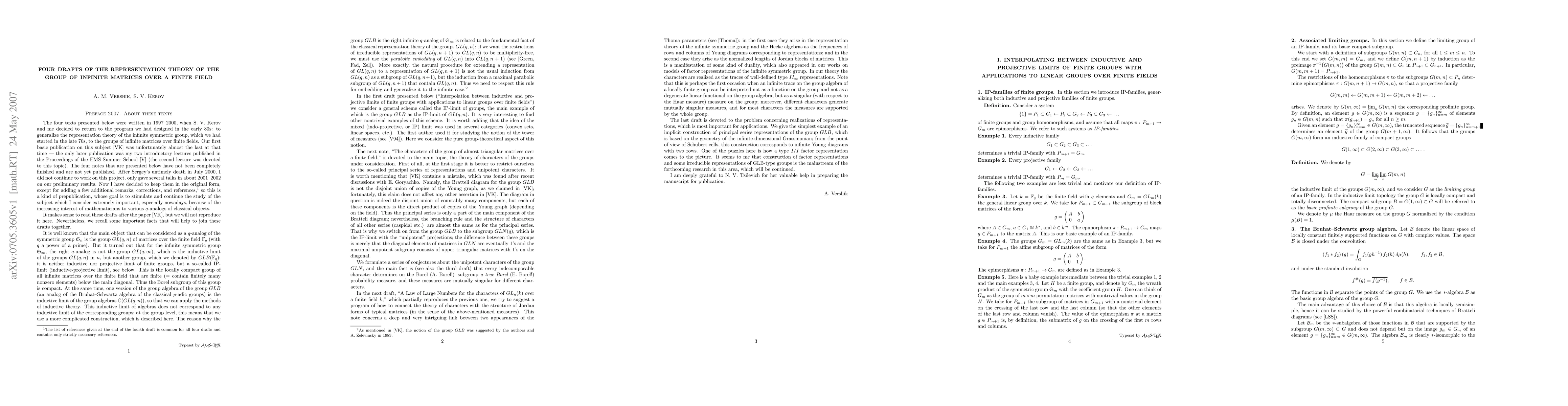 Preface (A.Vershik) - about these texts (3.); I.Interpolation between inductive and projective limits of finite groups with applicatons to linear groups over finite fields; II.The characters of the groups of almost triangle matrices over finite filed; III.A Law of Large Numbers for the characters of GL_n(k) over finite field k; IV.An outline of construction of factor representations of the group GLB(F_q).