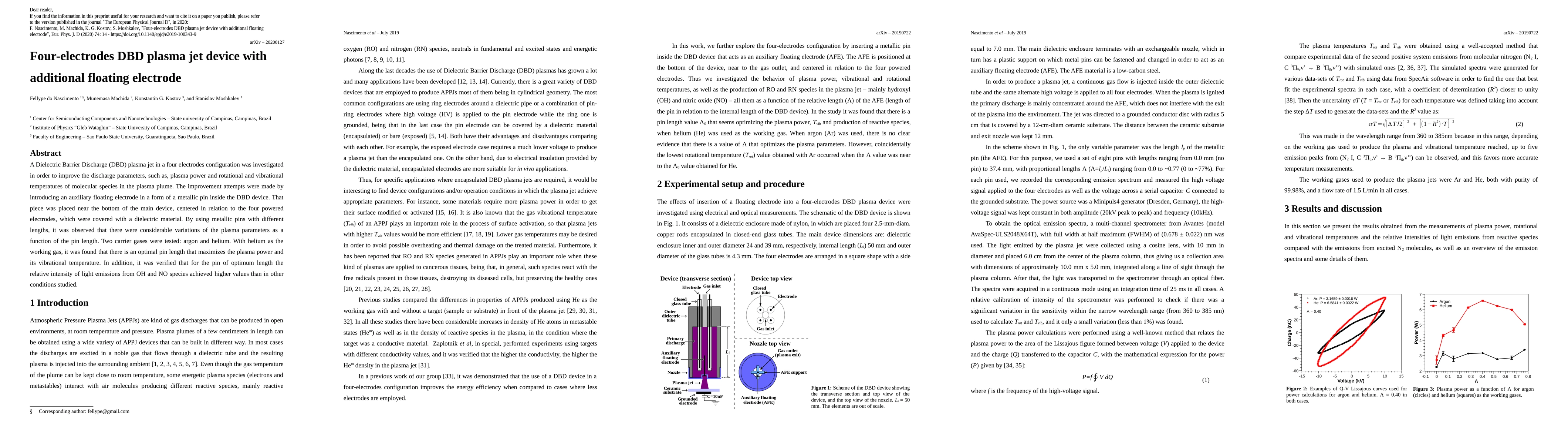 A new DBD plasma jet device was created with an additional floating electrode, which improved plasma power and molecular species temperatures when using helium as a carrier gas. An optimal pin length was found to maximize these benefits.