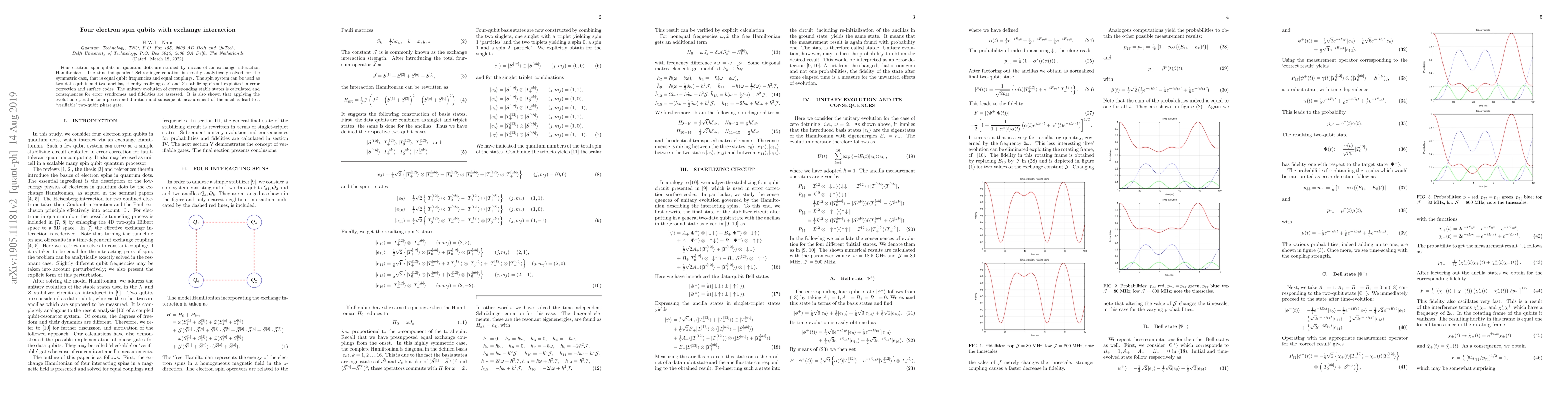 Four electron spin qubits in quantum dots are studied by means of an exchange interaction Hamiltonian. The time-independent Schr\"odinger equation is exactly analytically solved for the symmetric case, that is equal qubit frequencies and equal couplings. The spin system can be used as two data-qubits and two ancillas, thereby realizing a $X$ and $Z$ stabilizing circuit exploited in error correction and surface codes. The unitary evolution of corresponding stable states is calculated and consequences for error syndromes and fidelities are assessed. It is also shown that applying the evolution operator for a prescribed duration and subsequent measurement of the ancillas lead to a `verifiable' two-qubit phase gate.