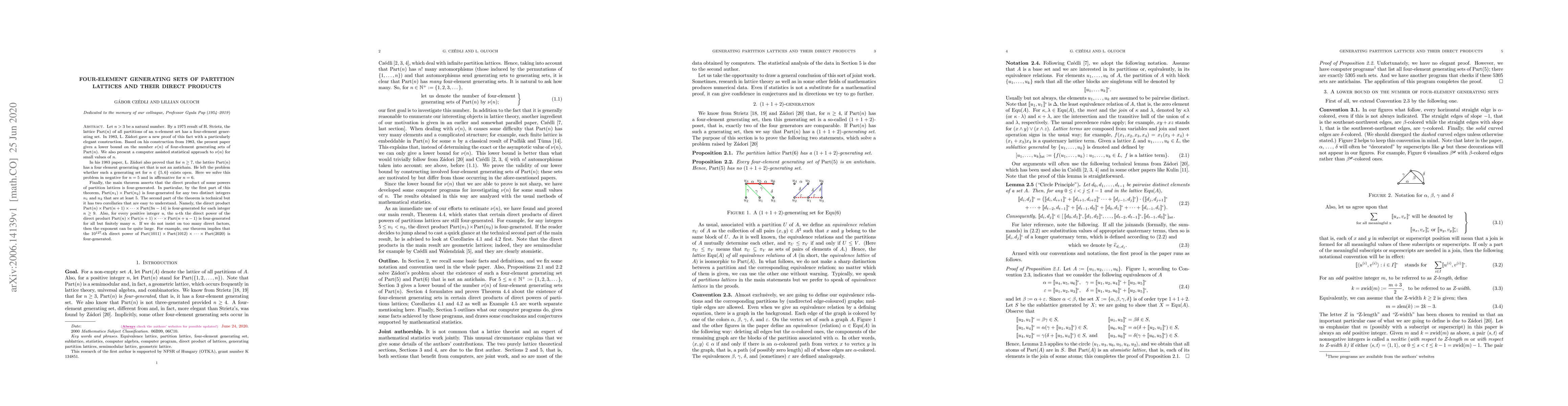 Let $n>3$ be a natural number. By a 1975 result of H. Strietz, the lattice Part$(n)$ of all partitions of an $n$-element set has a four-element generating set. In 1983, L. Z\'adori gave a new proof of this fact with a particularly elegant construction. Based on his construction from 1983, the present paper gives a lower bound on the number $\nu(n)$ of four-element generating sets of Part$(n)$. We also present a computer assisted statistical approach to $\nu(n)$ for small values of $n$. In his 1983 paper, L. Z\'adori also proved that for $n\geq 7$, the lattice Part$(n)$ has a four element generating set that is not an antichain. He left the problem whether such a generating set for $n\in\{5,6\}$ exists open. Here we solve this problem in negative for $n=5$ and in affirmative for $n=6$. Finally, the main theorem asserts that the direct product of some powers of partition lattices is four-generated. In particular, by the first part of this theorem, Part$(n_1)\times$ Part$(n_2)$ is four-generated for any two distinct integers $n_1$ and $n_2$ that are at least 5. The second part of the theorem is technical but it has two corollaries that are easy to understand. Namely, the direct product Part$(n)$ $\times$ Part$(n+1)$ $\times\dots\times$ Part$(3n-14)$ is four-generated for each integer $n\geq 9$. Also, for every positive integer $u$, the $u$-th the direct power of the direct product Part$(n)$ $\times$ Part$(n+1)$ $\times\dots\times$ Part$(n+u-1)$ is four-generated for all but finitely many $n$. If we do not insist on too many direct factors, then the exponent can be quite large. For example, our theorem implies that the $10^{127}$-th direct power of Part$(1011)$ $\times$ Part$(1012)$ $\times \dots \times$ Part$(2020)$ is four-generated.