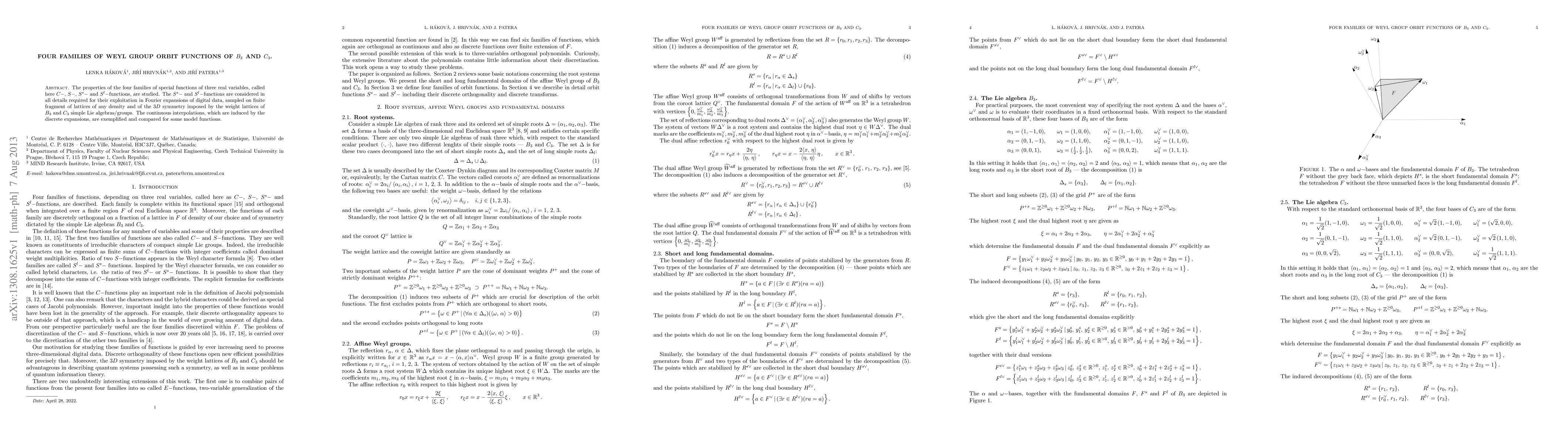 The properties of the four families of special functions of three real variables, called here C-, S-, S^s- and S^l-functions, are studied. The S^s- and S^l-functions are considered in all details required for their exploitation in Fourier expansions of digital data, sampled on finite fragment of lattices of any density and of the 3D symmetry imposed by the weight lattices of B_3 and C_3 simple Lie algebras/groups. The continuous interpolations, which are induced by the discrete expansions, are exemplified and compared for some model functions.