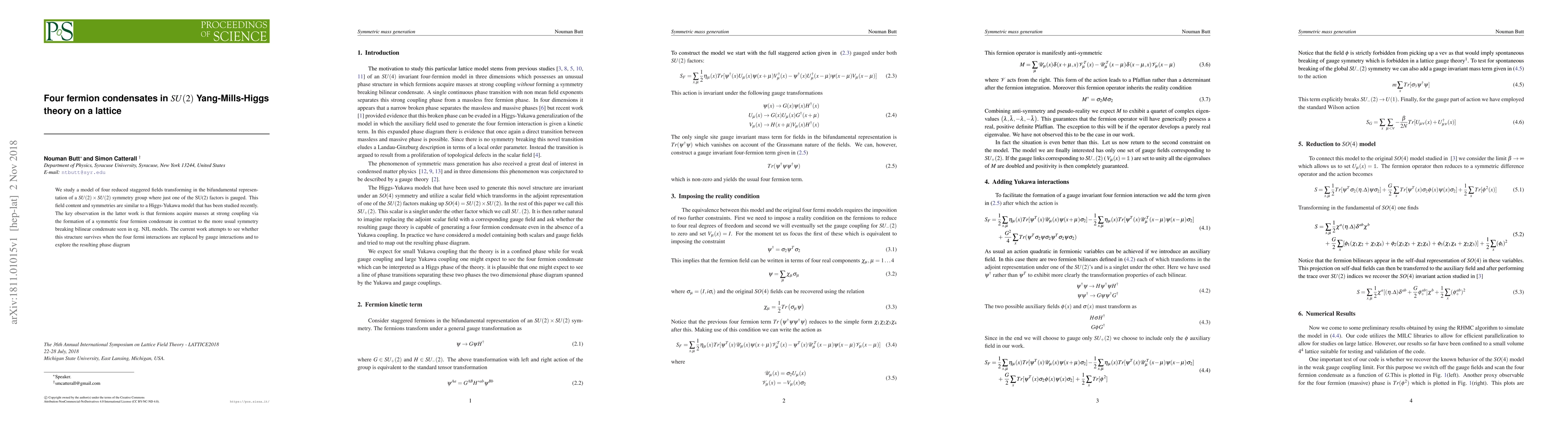 We study a model of four reduced staggered fields transforming in the bifundamental representation of a $SU(2)\times SU(2)$ symmetry group where just one of the SU(2) factors is gauged. This field content and symmetries are similar to a Higgs-Yukawa model that has been studied recently. The key observation in the latter work is that fermions acquire masses at strong coupling via the formation of a symmetric four fermion condensate in contrast to the more usual symmetry breaking bilinear condensate seen in eg. NJL models. The current work attempts to see whether this structure survives when the four fermi interactions are replaced by gauge interactions and to explore the resulting phase diagram.