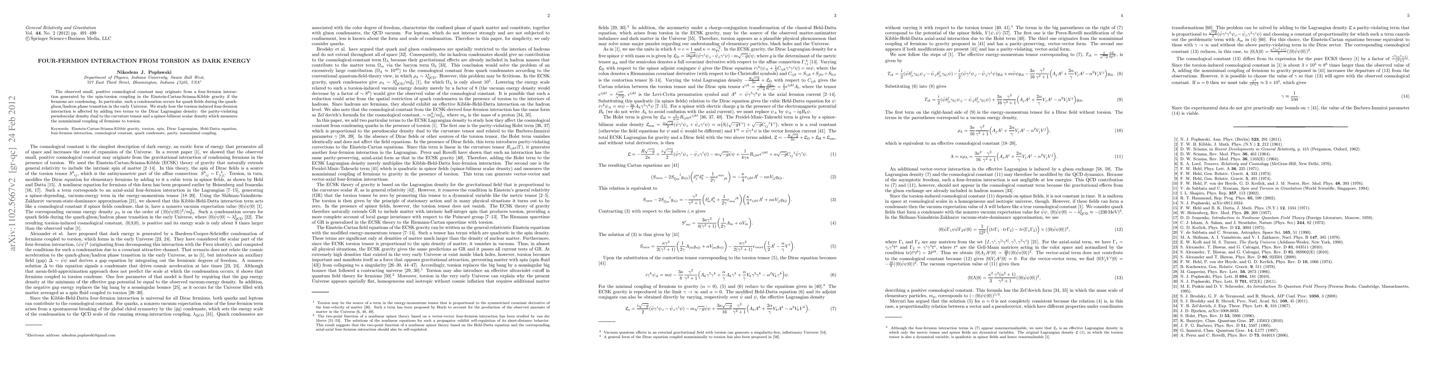 This paper explores how a four-fermion interaction, driven by spin-torsion coupling in the Einstein-Cartan-Sciama-Kibble gravity, could account for the observed dark energy. It investigates the effects of torsion on quark fields during the quark-gluon/hadron phase transition, considering additional terms in the Dirac Lagrangian density.