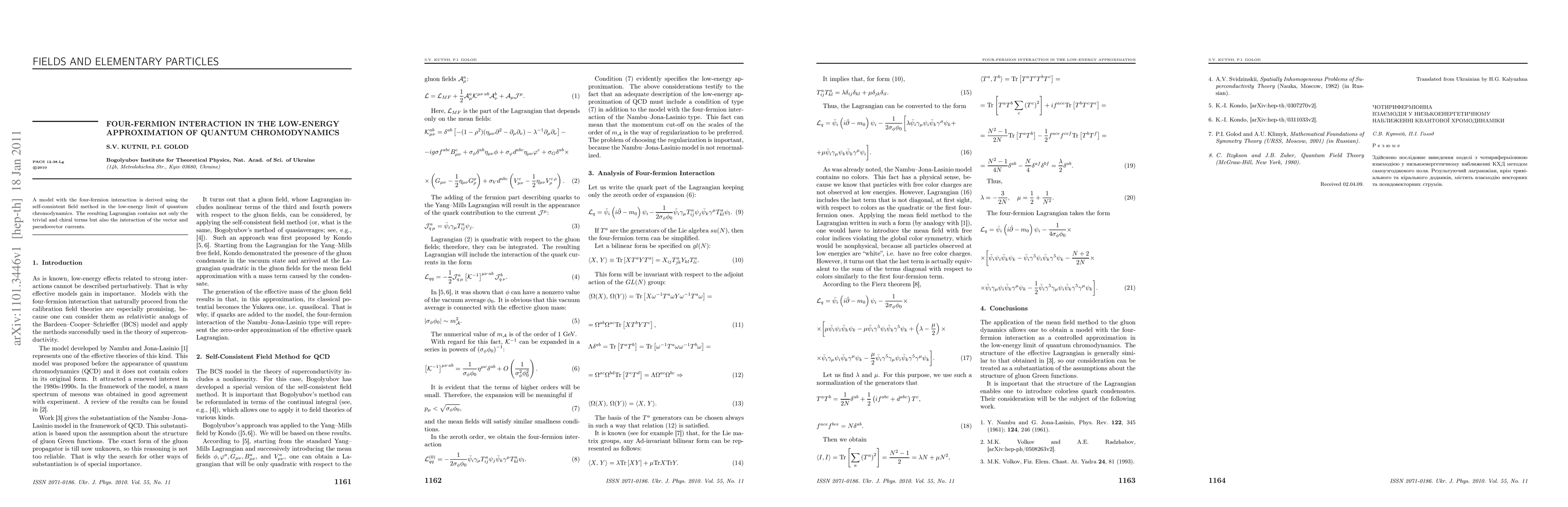 A model with the four-fermion interaction is derived using the self-consistent field method in the low-energy limit of quantum chromodynamics. The resulting Lagrangian contains not only the trivial and chiral terms but also the interaction of the vector and pseudovector currents.