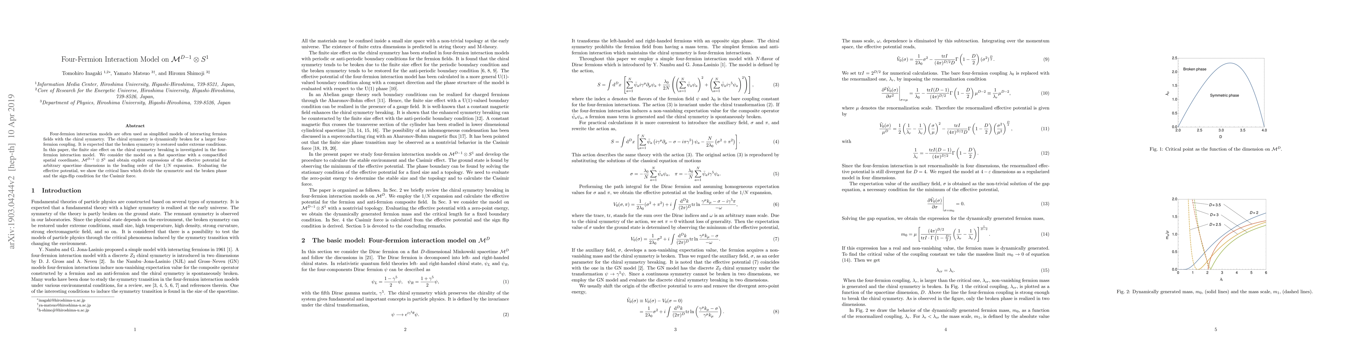 This paper investigates the finite size effects on chiral symmetry breaking in a four-fermion interaction model defined on $\mathcal{M}^{D-1} \otimes S^1$. It derives explicit expressions for the effective potential in leading order $1/N$ expansion, revealing critical lines distinguishing symmetric and broken phases, and discusses the sign-flip condition for the Casimir force.
