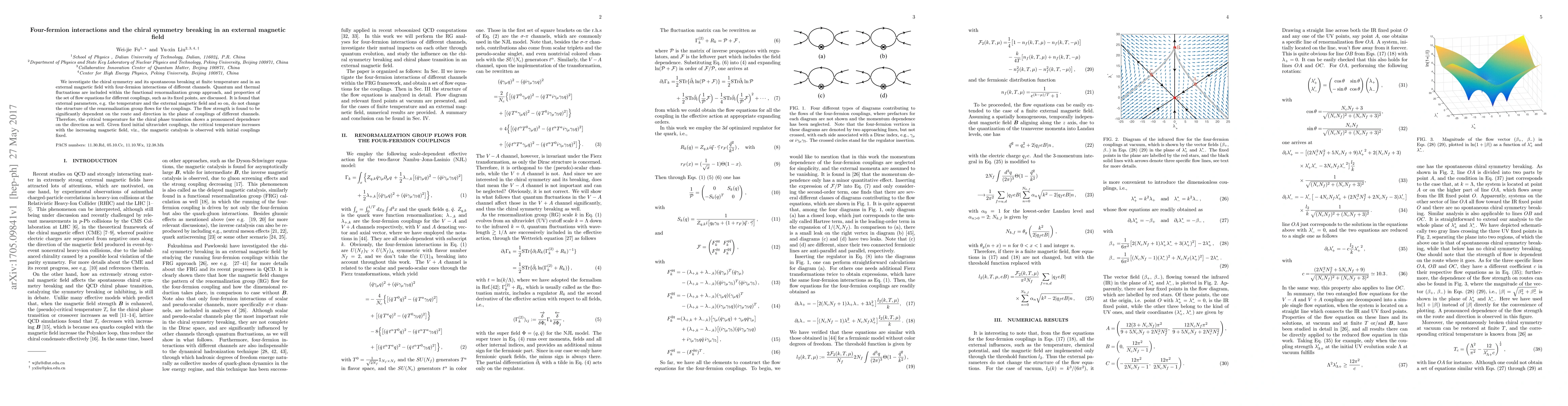 We investigate the chiral symmetry and its spontaneous breaking at finite temperature and in an external magnetic field with four-fermion interactions of different channels. Quantum and thermal fluctuations are included within the functional renormalization group approach, and properties of the set of flow equations for different couplings, such as its fixed points, are discussed. It is found that external parameters, e.g. the temperature and the external magnetic field and so on, do not change the structure of the renormalization group flows for the couplings. The flow strength is found to be significantly dependent on the route and direction in the plane of couplings of different channels. Therefore, the critical temperature for the chiral phase transition shows a pronounced dependence on the direction as well. Given fixed initial ultraviolet couplings, the critical temperature increases with the increasing magnetic field, viz., the magnetic catalysis is observed with initial couplings fixed.