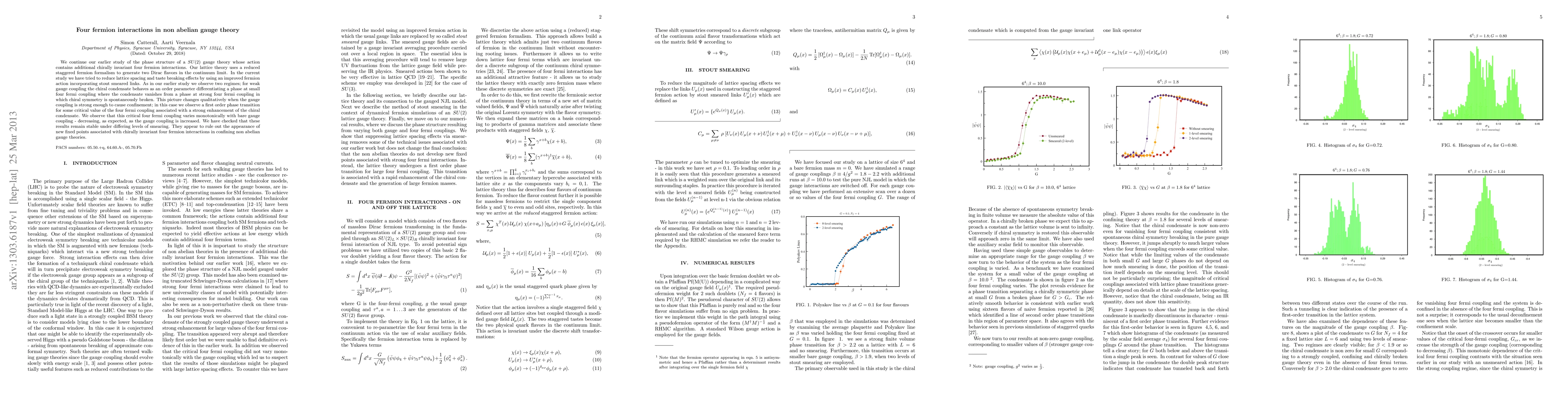 This paper investigates the phase structure of SU(2) gauge theory with chirally invariant four fermion interactions, finding two regimes based on gauge coupling strength. It observes a first-order phase transition at strong gauge coupling, linked to a strong enhancement of the chiral condensate.