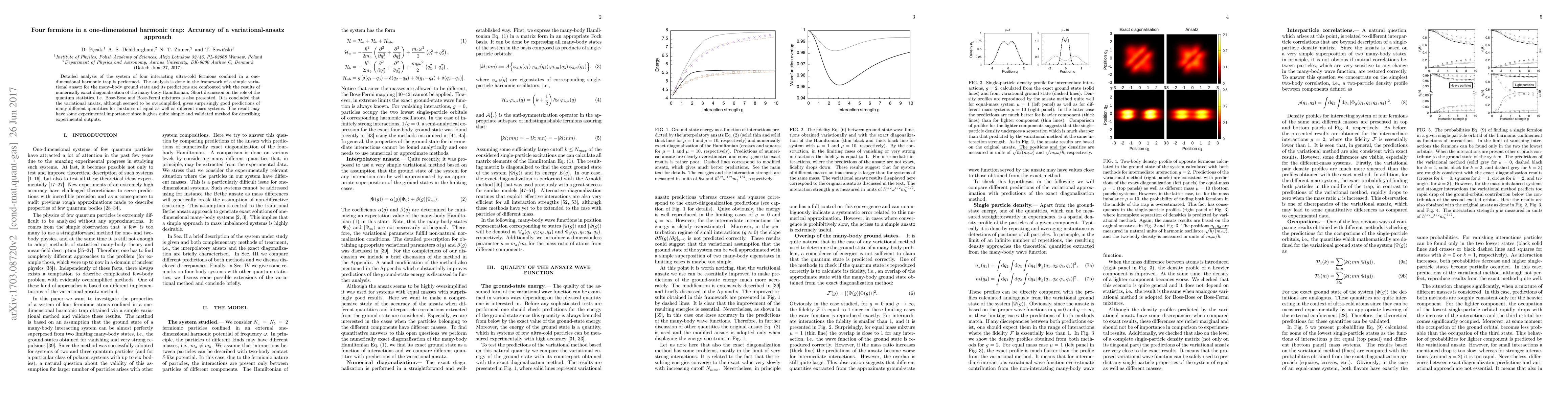 Detailed analysis of the system of four interacting ultra-cold fermions confined in a one-dimensional harmonic trap is performed. The analysis is done in the framework of a simple variational ansatz for the many-body ground state and its predictions are confronted with the results of numerically exact diagonalization of the many-body Hamiltonian. Short discussion on the role of the quantum statistics, i.e. Bose-Bose and Bose-Fermi mixtures is also presented. It is concluded that the variational ansatz, although seemed to be oversimplified, gives surprisingly good predictions of many different quantities for mixtures of equal as well as different mass systems. The result may have some experimental importance since it gives quite simple and validated method for describing experimental outputs.