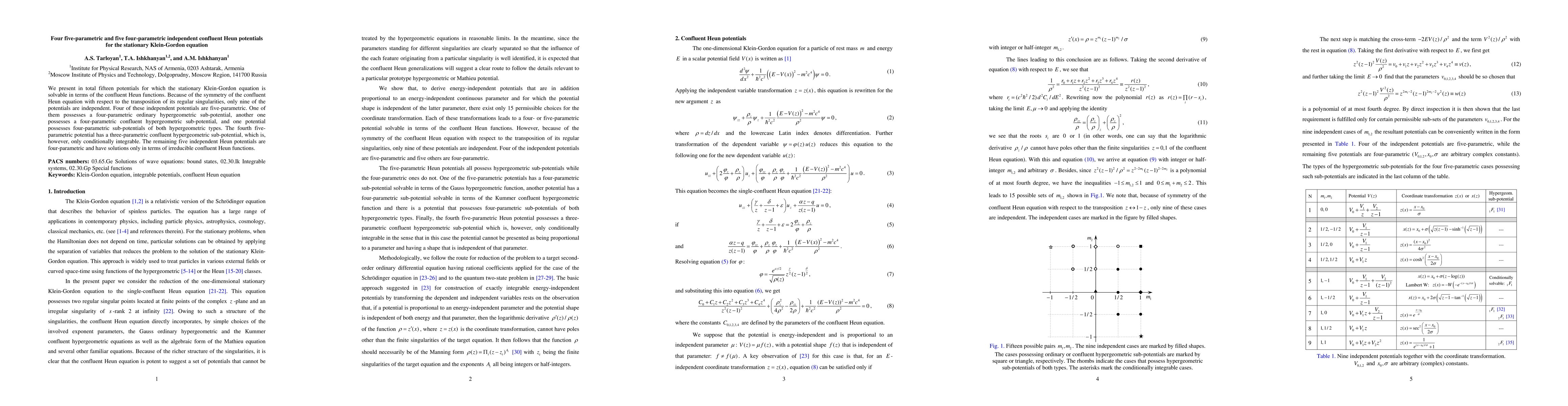 This paper introduces fifteen potentials for the stationary Klein-Gordon equation, solvable via confluent Heun functions, with nine being independent due to symmetry. Four five-parametric potentials include various hypergeometric sub-potentials, while five four-parametric potentials yield solutions exclusively in irreducible confluent Heun functions.