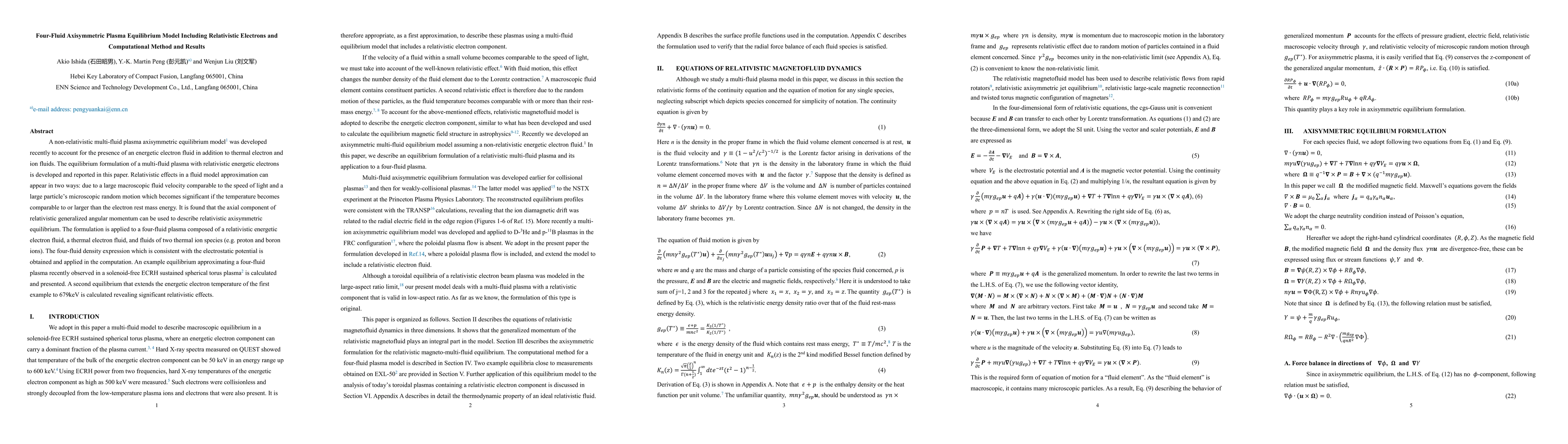 This paper presents a four-fluid plasma equilibrium model incorporating relativistic effects on energetic electrons, along with thermal electron and ion fluids. It introduces the use of axial component of relativistic generalized angular momentum for describing relativistic axisymmetric equilibrium. The model is applied to a spherical torus plasma example, demonstrating significant relativistic effects at high energetic electron temperatures.