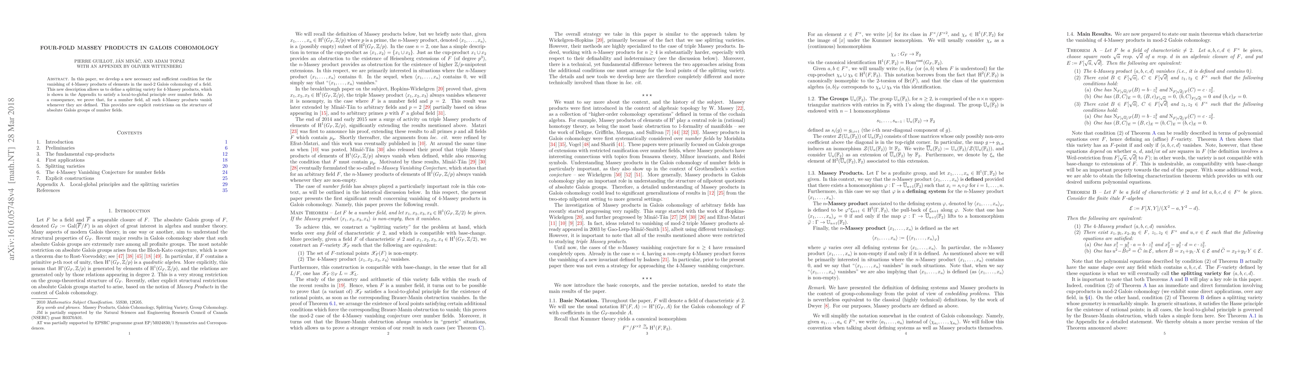 This paper establishes a new condition for the vanishing of four-fold Massey products in mod-2 Galois cohomology, defining a splitting variety that upholds a local-to-global principle over number fields, ultimately proving that all such products vanish for number fields.