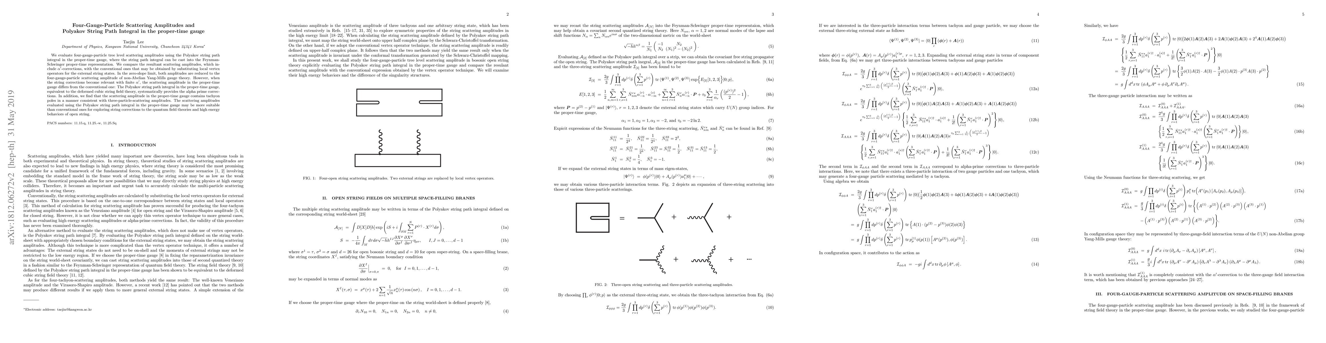 This paper evaluates four-gauge-particle scattering amplitudes using the Polyakov string path integral in the proper-time gauge and finds that it provides α' corrections, differing from conventional methods. The scattering amplitudes evaluated here may better capture string corrections in quantum field theories and high-energy behaviors of open strings.