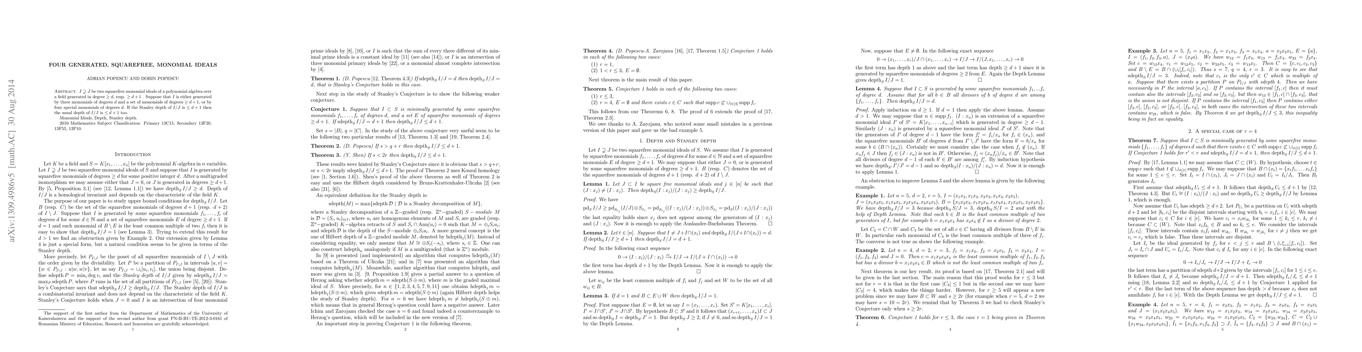 Let $I\supsetneq J$ be two squarefree monomial ideals of a polynomial algebra over a field generated in degree $\geq d$, resp. $\geq d+1$ . Suppose that $I$ is either generated by three monomials of degrees $d$ and a set of monomials of degrees $\geq d+1$, or by four special monomials of degrees $d$. If the Stanley depth of $I/J$ is $\leq d+1$ then the usual depth of $I/J$ is $\leq d+1$ too.