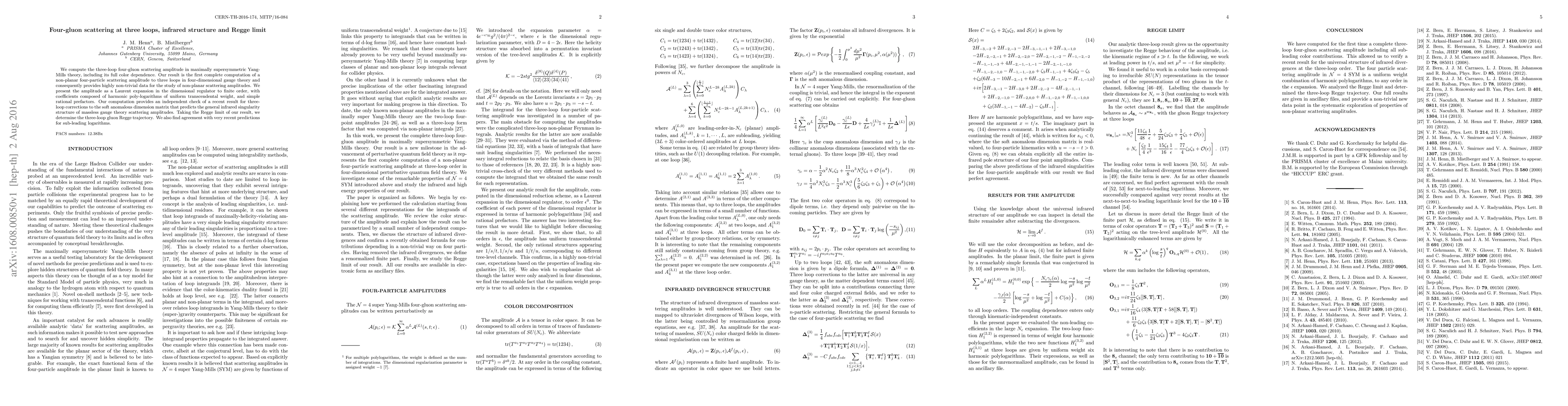 This paper presents the first complete three-loop computation of a non-planar four-gluon scattering amplitude in supersymmetric Yang-Mills theory, providing significant data for studying non-planar scattering amplitudes. The result includes the full color dependence and agrees with recent predictions for infrared singularities and sub-leading logarithms, also determining the three-loop gluon Regge trajectory.