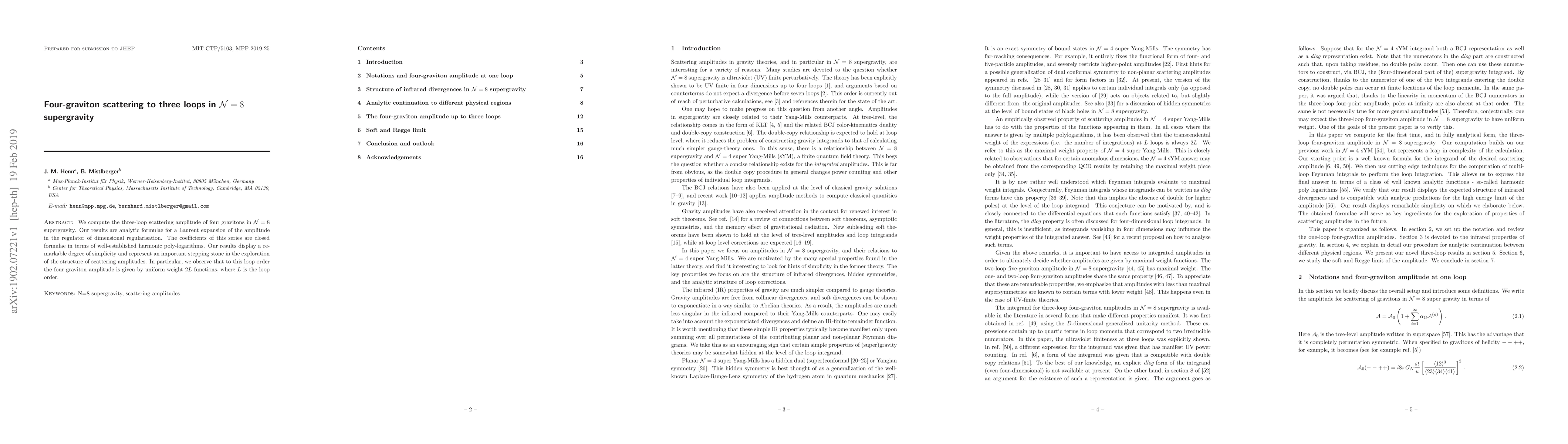 This paper presents the three-loop scattering amplitude for four gravitons in ${\mathcal N}=8$ supergravity, providing analytic expressions in terms of harmonic poly-logarithms. The results show a notable simplicity and indicate that the amplitude is represented by uniform weight $2L$ functions, where $L$ is the loop order.