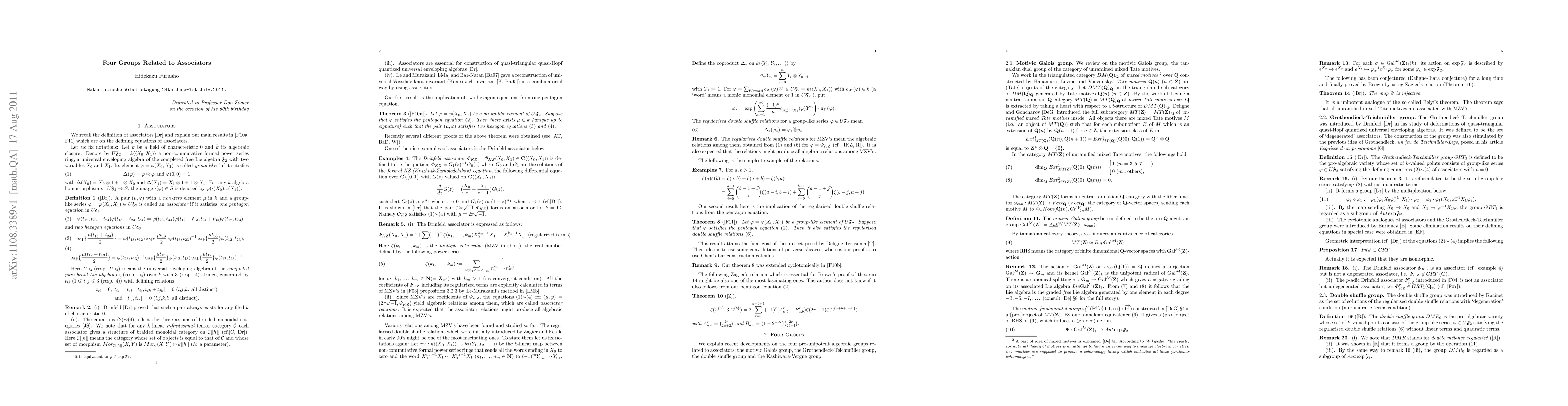 The paper discusses four pro-unipotent algebraic groups related to associators: the motivic Galois group, the Grothendieck-Teichmuller group, the double shuffle group, and the Kashiwara-Vergne group. It reviews these groups, their properties, and their interconnections, particularly focusing on the regularized double shuffle relations and the pentagon equation.