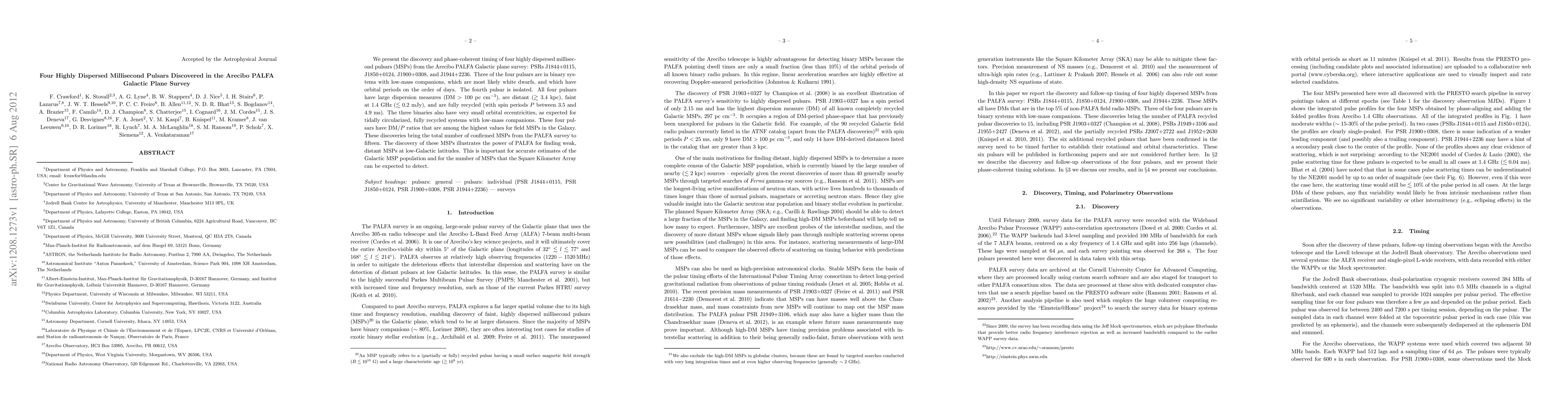 The Arecibo PALFA Galactic Plane Survey discovered four highly dispersed millisecond pulsars, three in binary systems with white dwarf companions and one isolated, all with large dispersion measures and faint signals. These findings enhance the understanding of the Galactic MSP population and the detection capabilities of future radio telescopes.