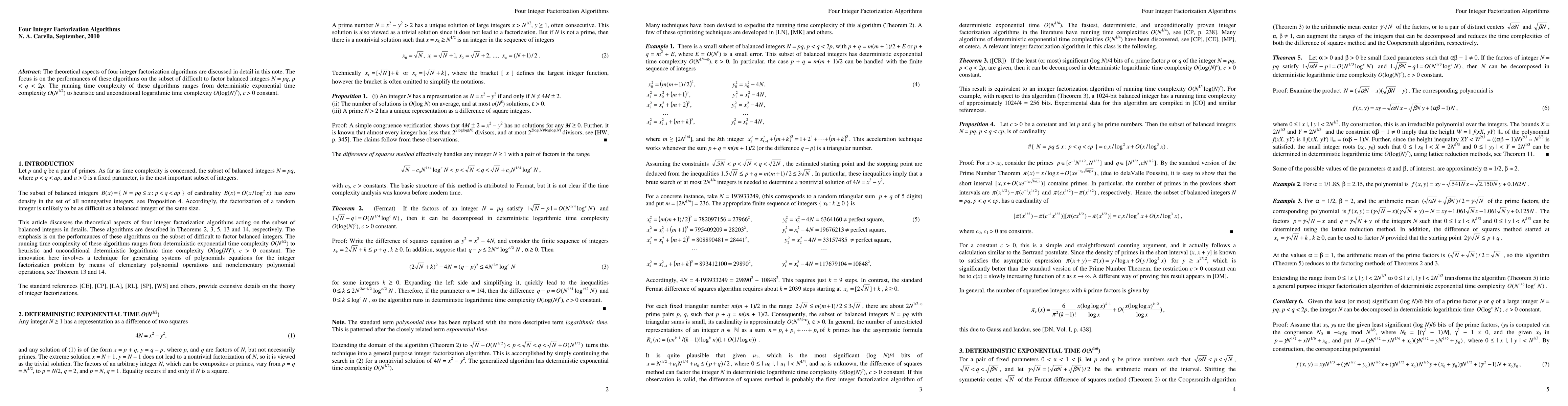 The theoretical aspects of four integer factorization algorithms are discussed in details in this note. The focus is on the performances of these algorithms on the subset of hard to factor balanced integers N = pq, p < q < 2p. The running time complexity of these algorithms ranges from deterministic exponential time complexity O(N^(1/2)) to heuristic and unconditional logarithmic time complexity O((log N)^c), c > 0 constant.
