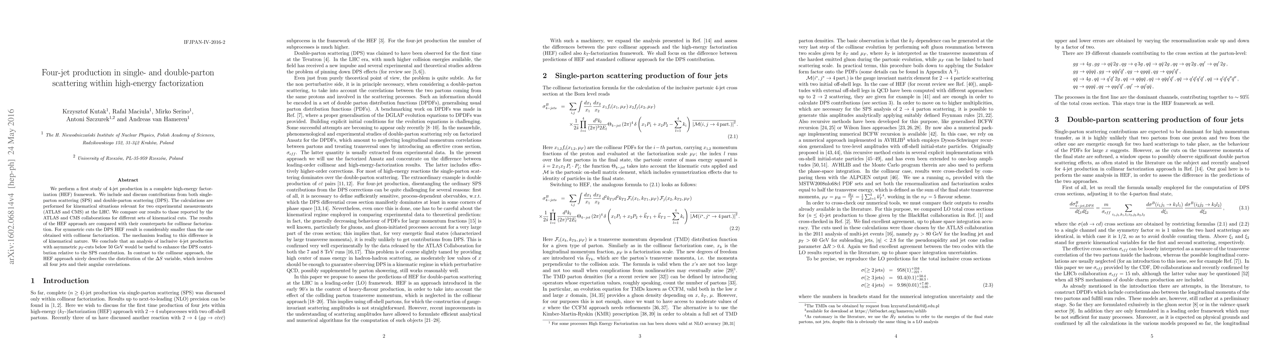 This paper investigates 4-jet production in high-energy factorization (HEF) frameworks, comparing single- and double-parton scattering contributions. It finds that HEF better describes angular correlations than collinear factorization and suggests asymmetric $p_T$-cuts for enhancing DPS relative to SPS.