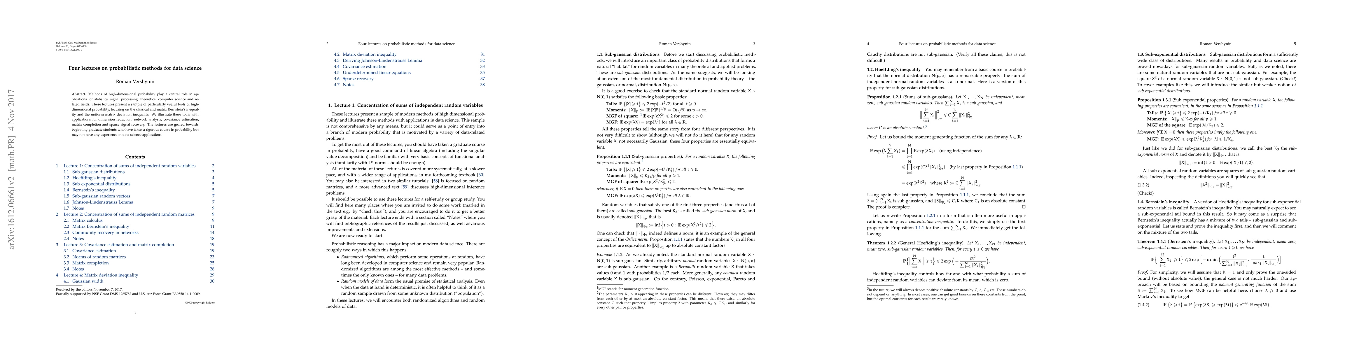 This paper provides an introduction to high-dimensional probability methods, focusing on classical and matrix Bernstein's inequalities and uniform matrix deviation inequalities. It applies these tools to dimension reduction, network analysis, and more, aimed at beginning graduate students with a background in probability.