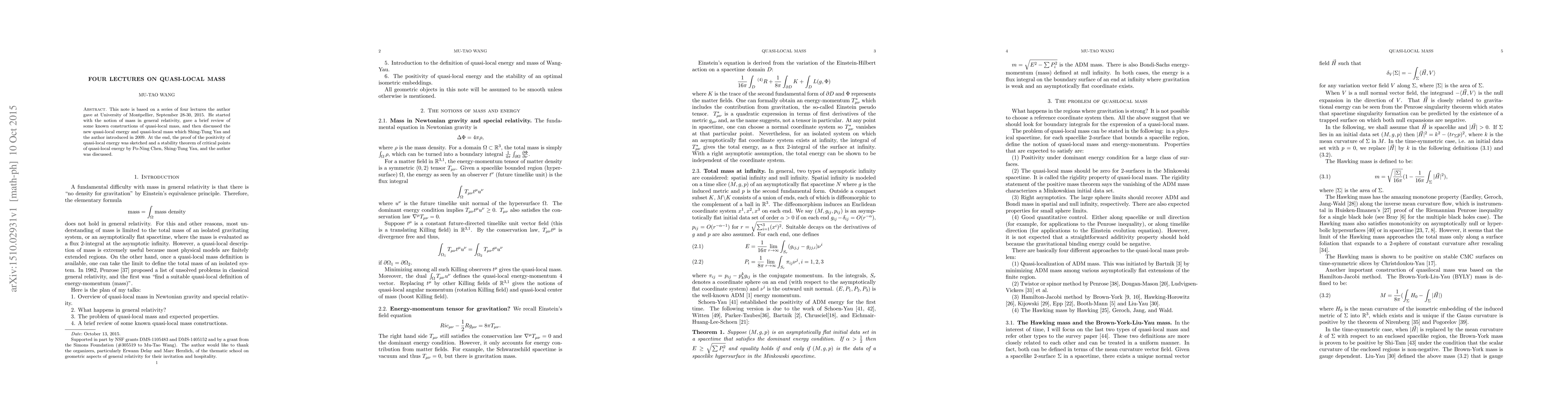 This note is based on a series of four lectures the author gave at University of Montpellier, September 28-30, 2015. He started with the notion of mass in general relativity, gave a brief review of some known constructions of quasi-local mass, and then discussed the new quasi-local energy and quasi-local mass which Shing-Tung Yau and the author introduced in 2009. At the end, the proof of the positivity of quasi-local energy was sketched and a stability theorem of critical points of quasi-local energy by Po-Ning Chen, Shing-Tung Yau, and the author was discussed.