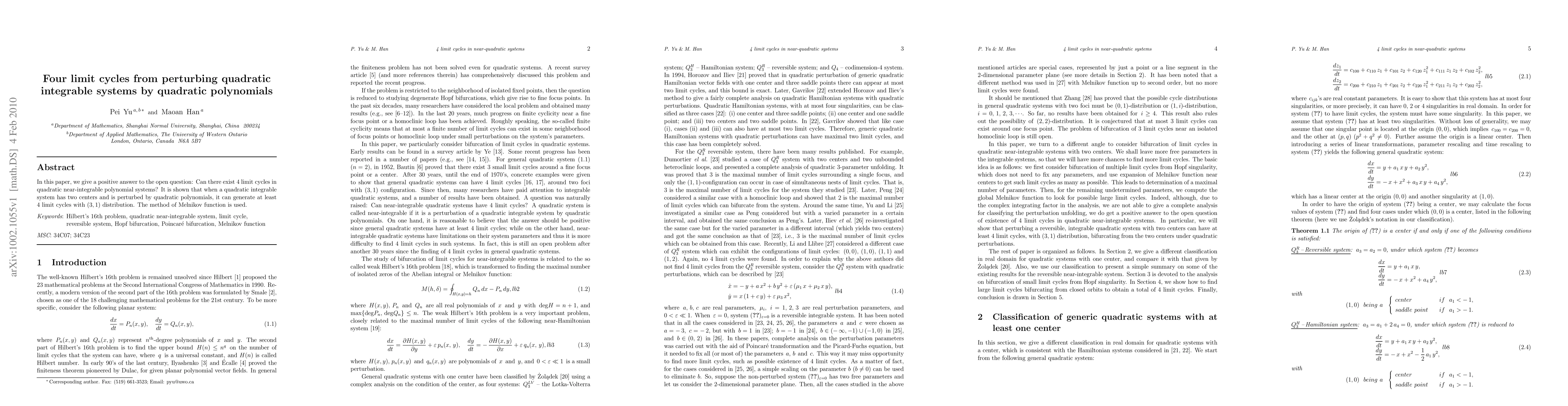 In this paper, we give a positive answer to the open question: Can there exist 4 limit cycles in quadratic near-integrable polynomial systems? It is shown that when a quadratic integrable system has two centers and is perturbed by quadratic polynomials, it can generate at least 4 limit cycles with (3,1) distribution. The method of Melnikov function is used.