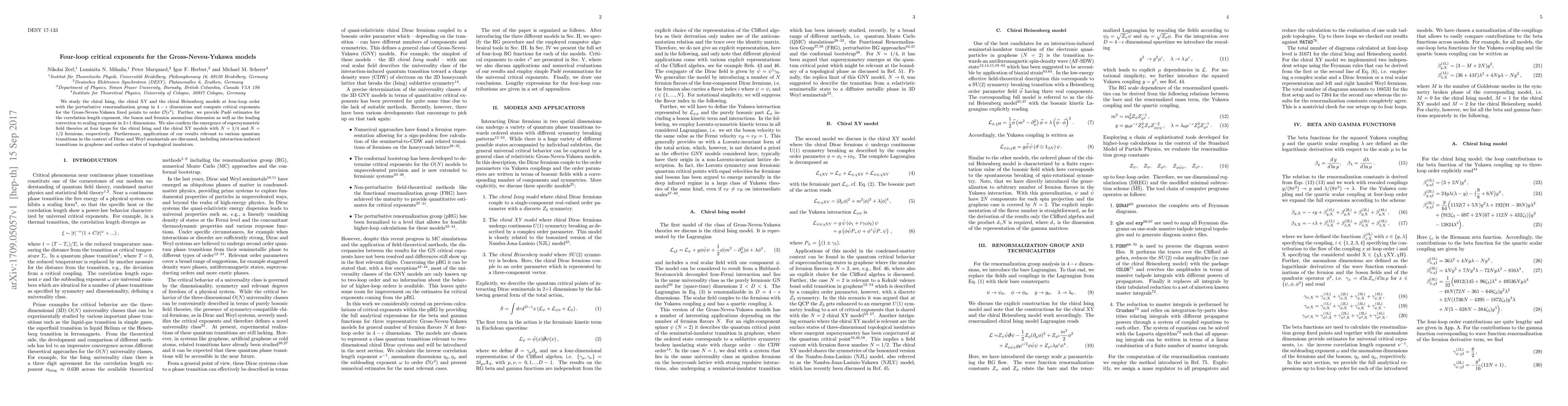 This paper computes four-loop critical exponents for chiral Ising, XY, and Heisenberg models using the perturbative renormalization group, providing detailed critical exponents to $\mathcal{O}(\epsilon^4)$ and Padé estimates for dimensions in 2+1. It also confirms the emergence of supersymmetric field theories at four loops for specific fermionic models and discusses applications to quantum transitions in Dirac and Weyl semimetals.