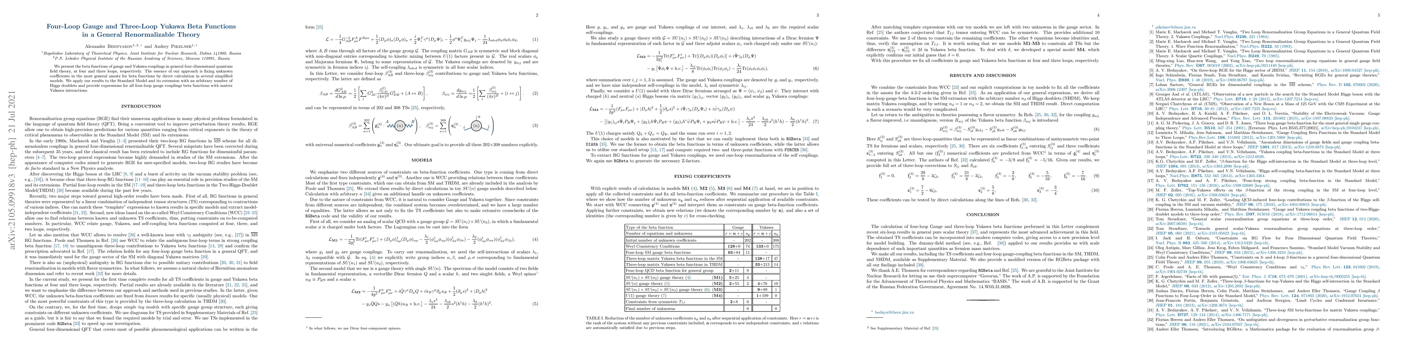 We present the beta functions of gauge and Yukawa couplings in general four-dimensional quantum field theory, at four and three loops, respectively. The essence of our approach is fixing unknown coefficients in the most general ansatz for beta-functions by direct calculation in several simplified models. We apply our results to the Standard Model and its extension with an arbitrary number of Higgs doublets and provide expressions for all four-loop gauge couplings beta-functions with matrix Yukawa interactions.